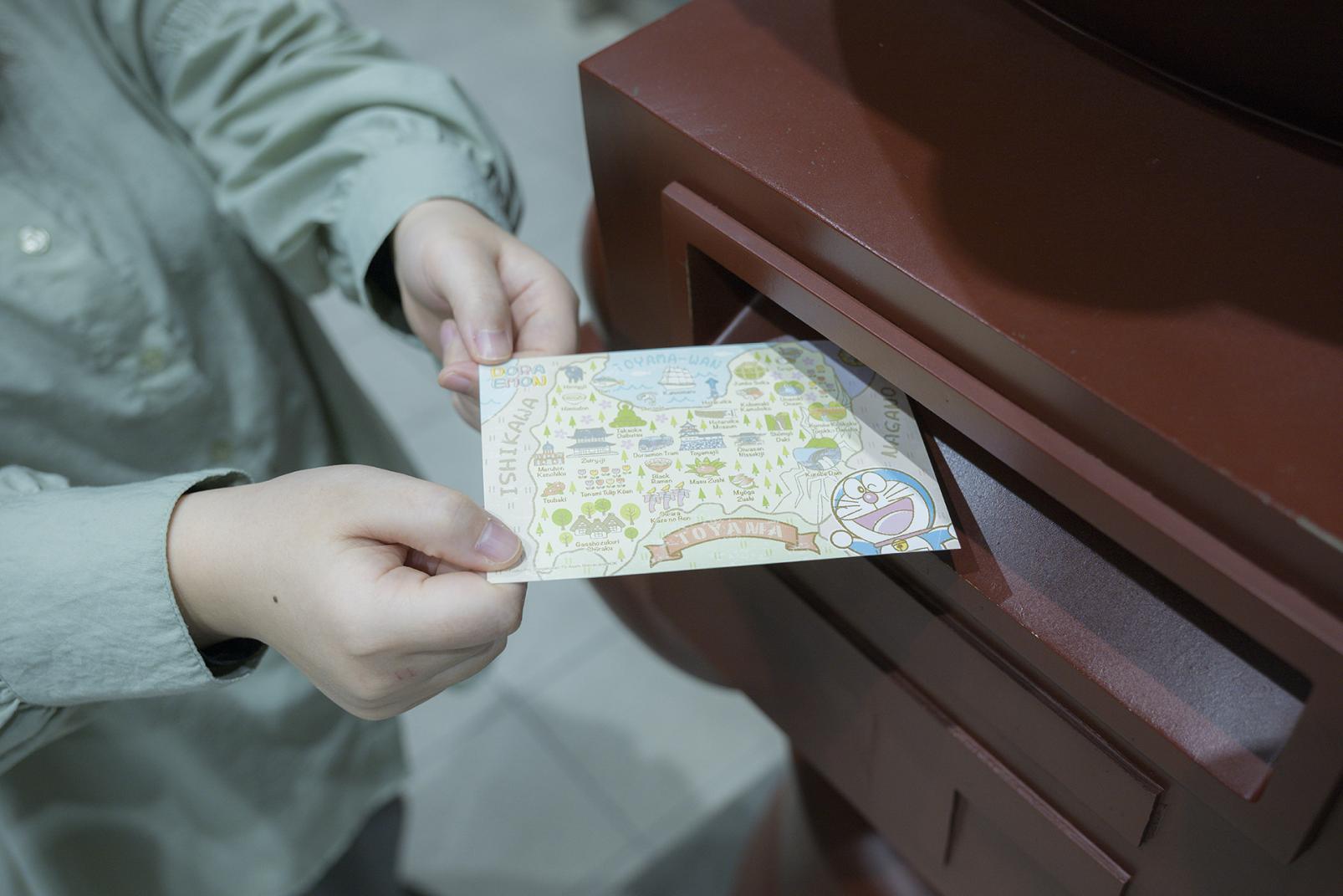ドラえもんと富山の風景をデザインした絵はがきは駅ビル「クルン」2Fにある「富岡屋」で販売中で、切手はそばのコンビニで購入できます。旅の記念に、家族や友人、自分宛てに手紙を送りましょう。