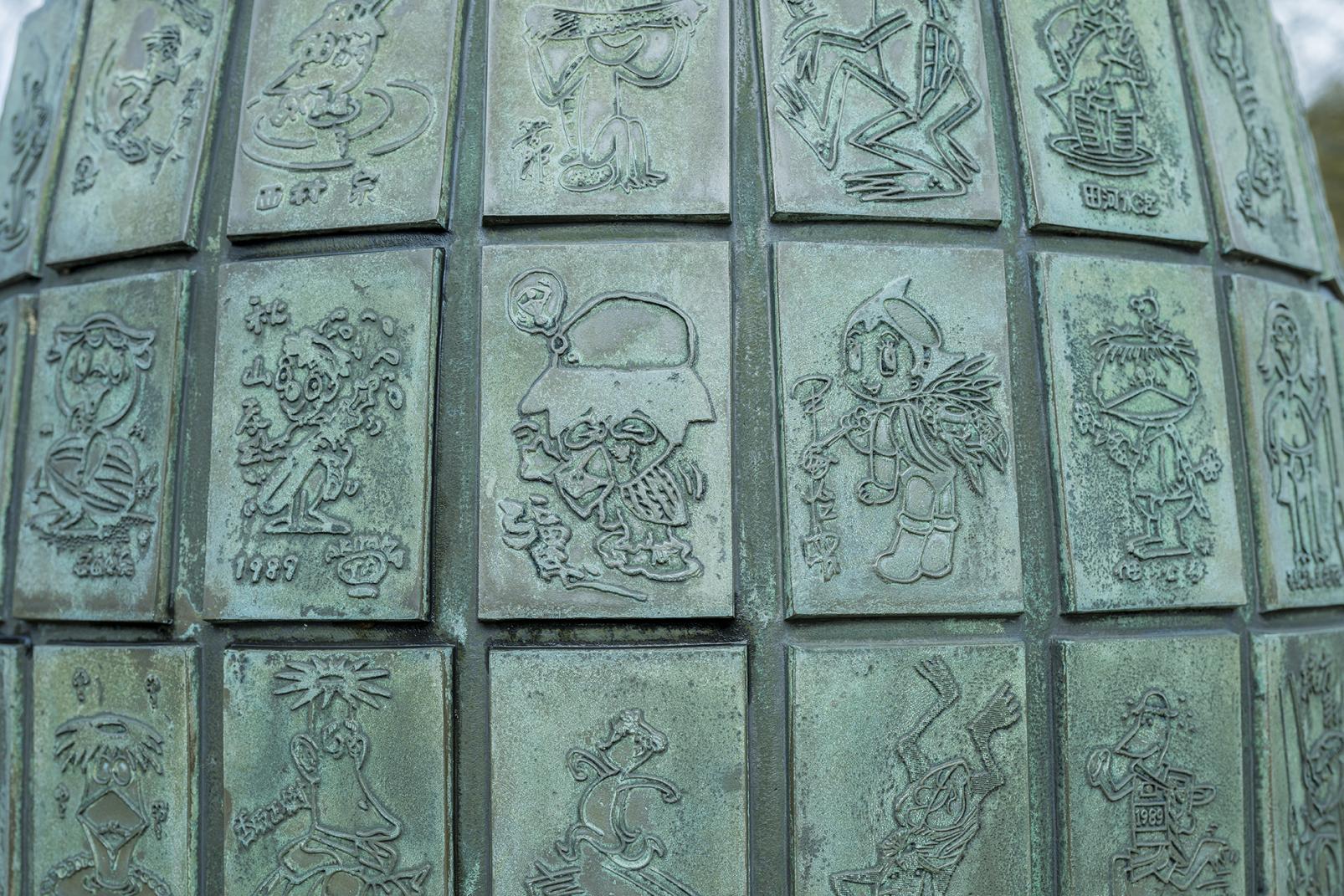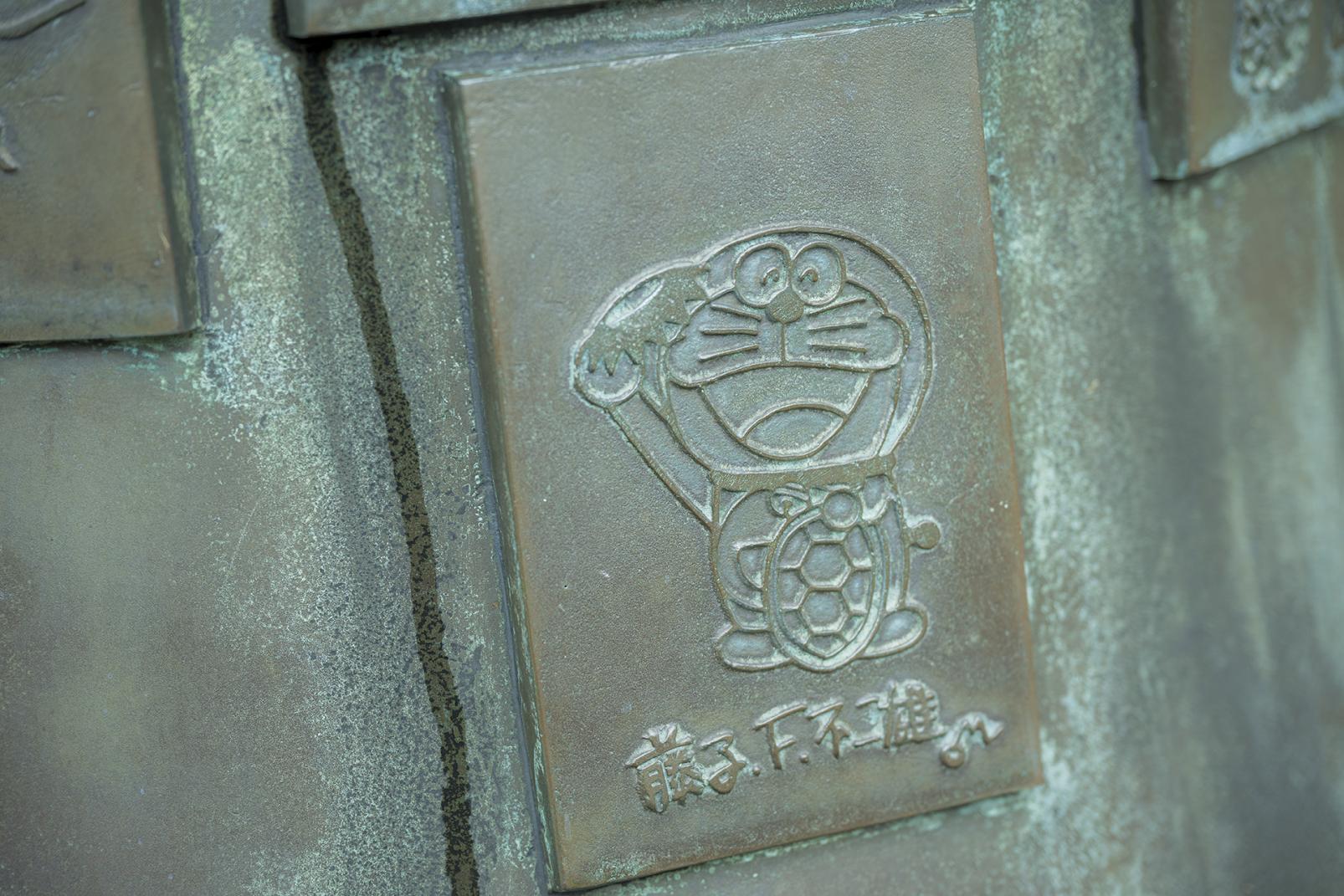 高岡市古城公園の動物園の中に、漫画家154人が描いた河童に扮したキャラクターをズラリと並べた「絵筆塔」があります。高岡銅器組合が漫画家たちの原画をレリーフ(浮彫細工)にして、ブロンズのモニュメントに仕上げました。藤子・F・不二雄先生が描いたのは、河童の皿を手にしたドラえもん。ほかにも手塚治虫先生作の河童頭の鉄腕アトムのレリーフがあります。