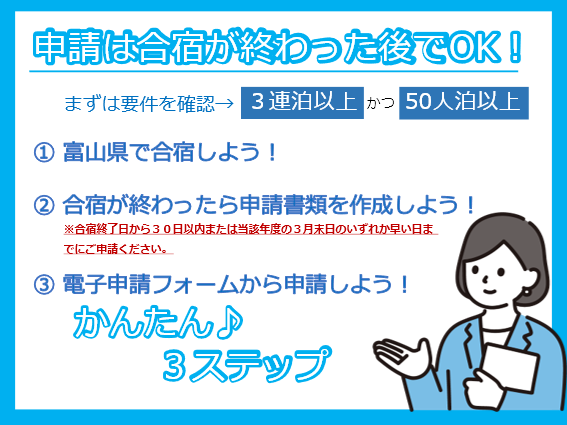 ○ 申請は合宿終了後でOK(終了日から30日以内)