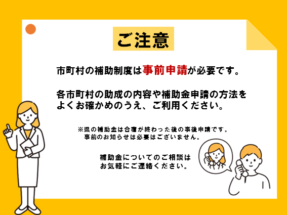 ※自治体ごとに申請方法が異なりますので、ご留意ください。その他、補助の対象となるかかわらない、申請の方法がわからない等のご相談はお気軽にご連絡ください。