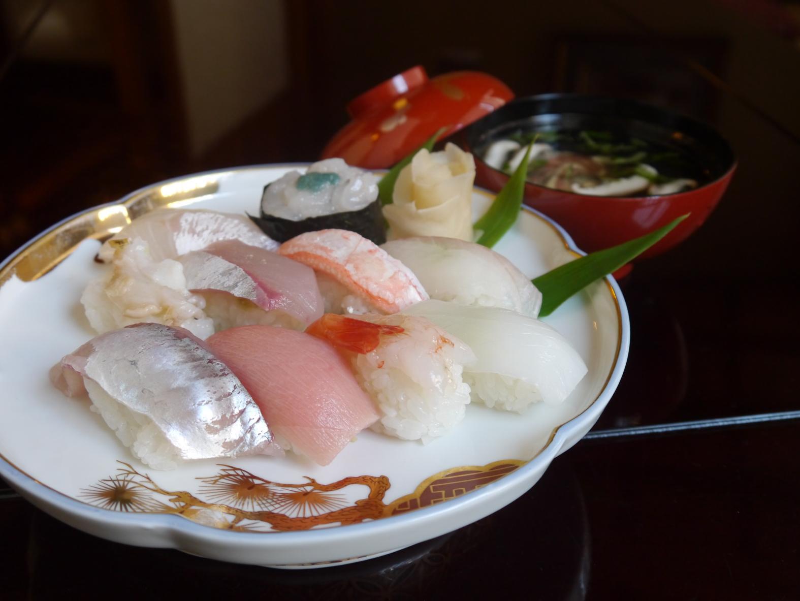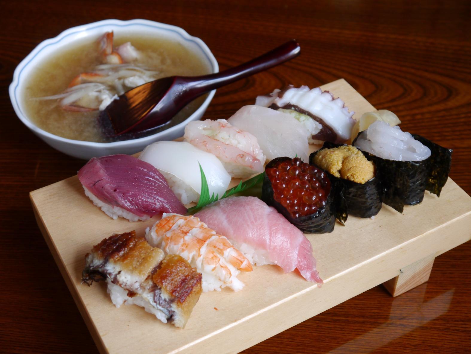 昼夜同一価格の旬の寿司でもてなす創業60年の老舗です。カウンター席を設けず、全席畳敷きのお座敷席に統一する空間は、「お寿司と会話を気ままに楽しめる」と女性や家族連れ客の人気が高く、習慣として通う常連客もたくさんいます。ちらし寿司や細巻きなどを織り込んだ盛り合わせや、握り10貫盛り合わせなどが、いずれも汁物付きで2,000円以下という良心価格も長く愛される理由のひとつです。