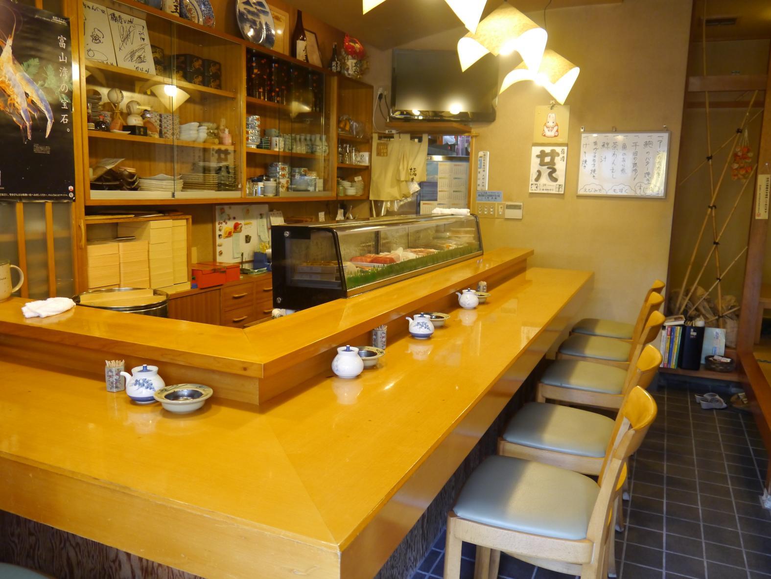 氷見漁港から毎日仕入れるネタは11月~2月頃のブリが特におススメ。かつては明け方近くまで営業していたことから、界隈では「お酒の〆のお寿司屋さん」として認知されており、地元の人からも長く愛されるお店です。創業来の店自慢として知られる鰻、鮪、イカ、数の子、いくら、しいたけ、きゅうり、玉子の8種類を詰め込んだ具沢山の「大名巻き」のチェックもお忘れなく。