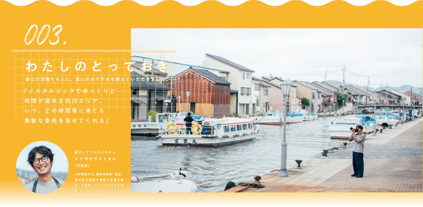 僕は射水市の生まれで、家族と一緒に今もここで暮らしています。地元で特に好きな場所は内川エリア。川岸 に漁船が停泊する風景が、イタリアのベニスに似ているので「日本のベニス」とも呼ばれています。長男が小学校に入る前からよく家族で遊びに来ていて、子どもたちの成長とともに、写真をたくさん撮った思い出の場所。県外の友人たちに内川の写真を見せると、必ずと言っていいほど「ここに行ってみたい!」と言われるので案内することも多いですね。