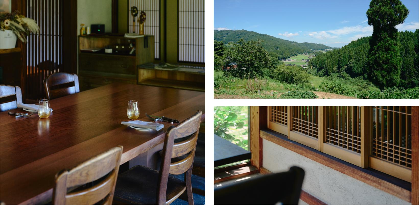 古い民家を改修した空間は、ところどころにかつての面影を残し、初めて訪れたとは思えないような親しみやすさを感じさせます。着席し、ダイニングスペースの大きな窓いっぱいに広がる景色を見渡すと一気に心がほぐれ、ゆったりとした心持ちに。厨房から聞こえる薪のはぜる音と炭の香りが心地よく食欲を刺激します。