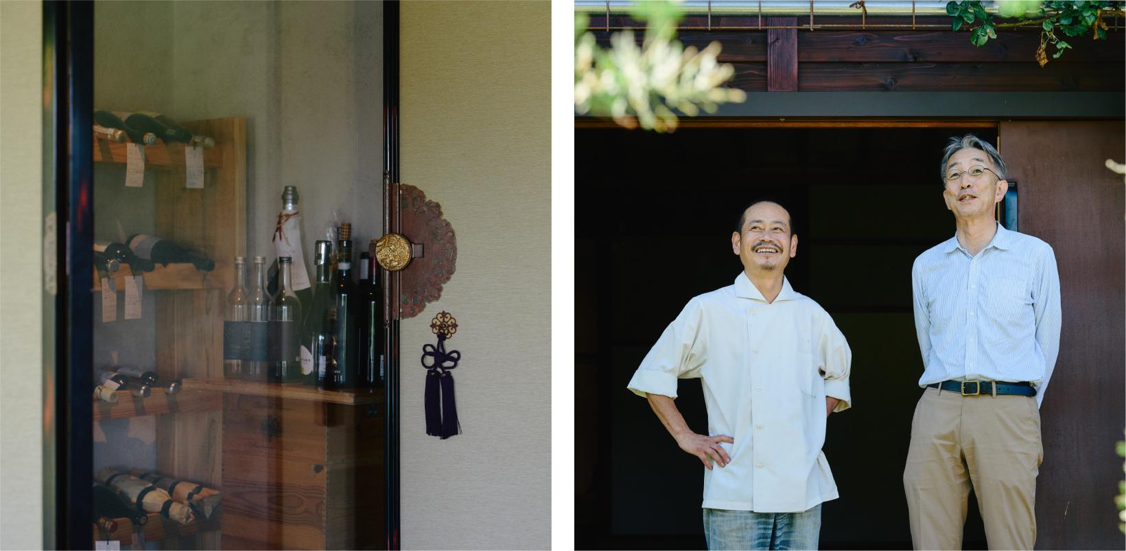 建物の柱や梁、外観は元のまま。仏間と床の間はワインセラーに生まれ変わりました。「本来、床の間は客人のおもてなしの場所。ゲストをもてなすためのお酒のあるべき空間とも言えます。また、牧谷シェフの思いを知るにつけ、この建物の歴史を伝える仏間はできるだけそのまま残したかった」とリノベーションを手がけた濱田さん。「シェフの考え方はものごとの本質について考えさせられ、また、いろいろな分野への発展性も感じられてとても興味深い取り組みだと思います」