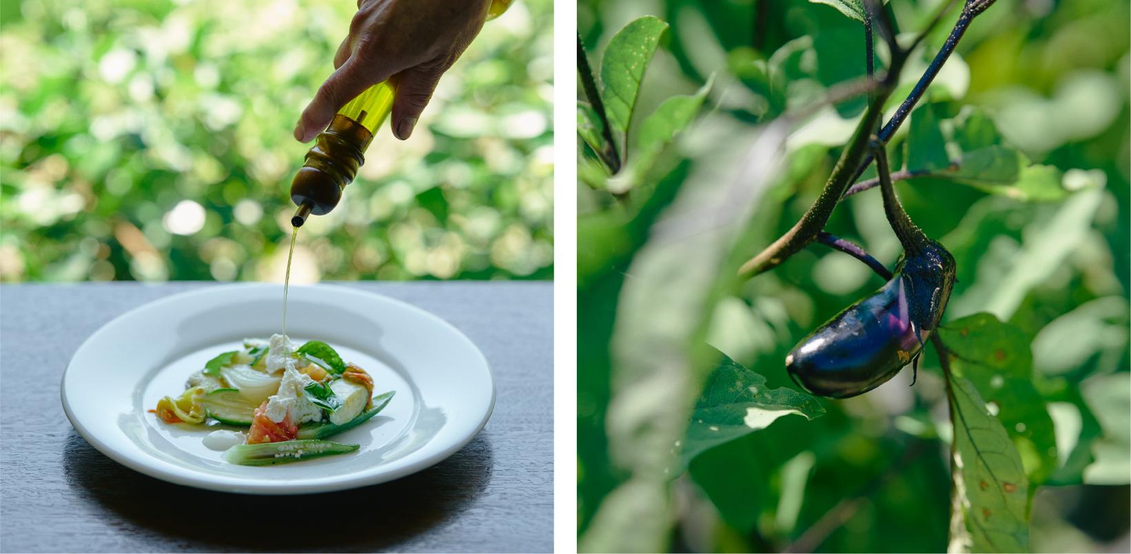 料理で使う野菜や米は、レストランから少し離れたところにある田畑で無農薬と有機肥料で、牧谷シェフが丁寧に育てています。氏が富山市からこの畑に通い続けて10年以上。「ラディッキオやアーティチョークなどのイタリア野菜は、かなり本場の味に近づいてきています」と自信をのぞかせます。 この日のランチの前菜は、新タマネギ、オクラ、花ズッキーニ、トマト、パプリカなどに新ニンニクのピューレと手作りのリコッタチーズを添えた鮮やかな一皿。個々に調理された野菜それぞれの食感の楽しさと素材そのものの甘みがなんとも印象的。コースには、氏が料理を学んだイタリアとスロべニアの国境近くの街で親しまれている郷土料理も組み込まれます。