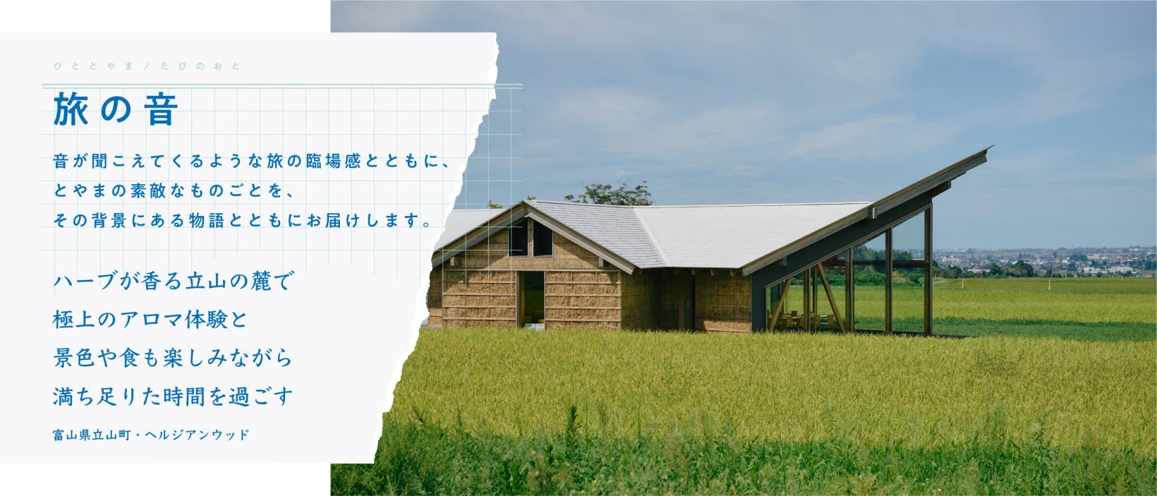 富山の「人」「つながり」にフォーカスし、そのバックストーリーを通じて富山ならではの魅力をお届けする「Hitotoyama」(ひととやま)。音が聞こえるような旅の臨場感をお伝えする特集「旅の音」では、ハーブ畑のほか、アロマ工房やレストランなども擁する立山町の「ヘルジアンウッド」に注目します。地元で活躍する方の “とやま愛” 溢れるおすすめの食やスポット、タイムリーな富山の旬の情報もお届けします。
