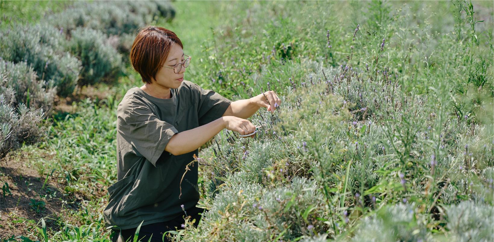 敷地内の農地では、前田さんの「世界一美しい日本の原風景をつくる」というビジョンに共感した有澤 渚(ありさわ なぎさ)さんが汗を流しています。ラベンダーをはじめ、ローズマリー、日本ハッカなど和洋のハーブを化学肥料や除草剤を使わずに栽培。「成長はゆっくりですが、土地に合わせて育てることをモットーにしています」と有澤さんが教えてくれました。ラベンダーは剪定で風通しをよくし、手作業も交えながら丁寧に花を摘み取るなど、栽培に手間ひまを惜しみません。「ハーブづくり、米づくりの過程の景色も、みなさんに楽しんでいただきたい」と語ります。