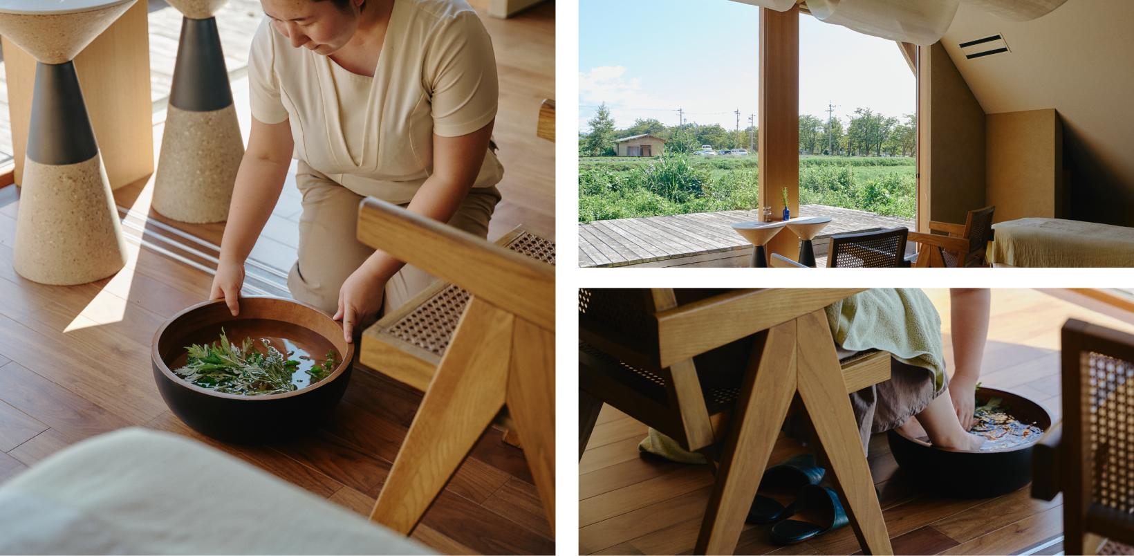 「Taroma」のエッセンシャルオイルを贅沢に使ったスパでは、ハーブ畑を眺めながらセラピストによるトリートメントを受けることができます。トリートメントの前に行う季節のハーブを使った足湯が、癒しの時間へのスイッチ。一人ひとりのコンディションに合わせて施術内容を決めるオーダーメイドのトリートメントで、疲れた心と体をほぐしてくれます。室内には2つのベッドが用意されているので、家族や友人と同時に施術を受けられます。