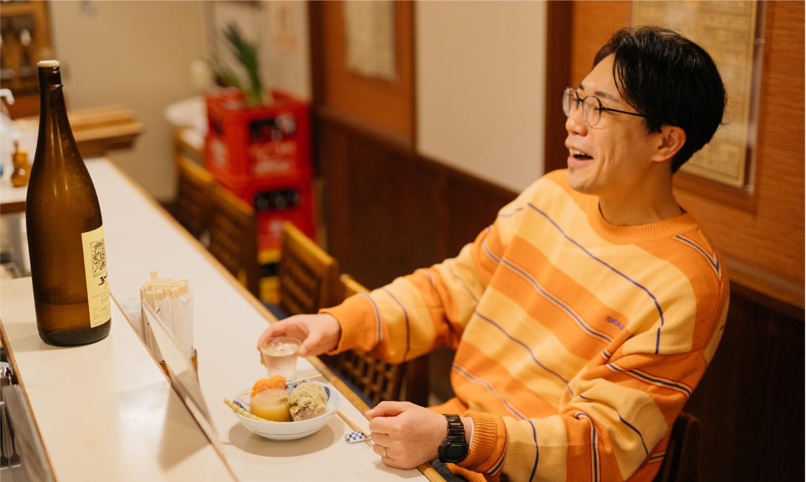 カウンター席のみなので、一人で来ても出張や観光で県外から来る「はじめまして」のお客さんとも会話が弾みます。ここでは歴代、富山大学の芸文(芸術文化)学部の友達や後輩が働いているので会いに来る楽しみもあります。以前はおでんをわざわざお店で食べるという概念がなかったけれど、「百福」で初めておでんを食べた時は少し大人になったような気がしました。いまでは僕にとってすごく心地良い場所の一つになっていて、ここで過ごす時間に粋を感じます。