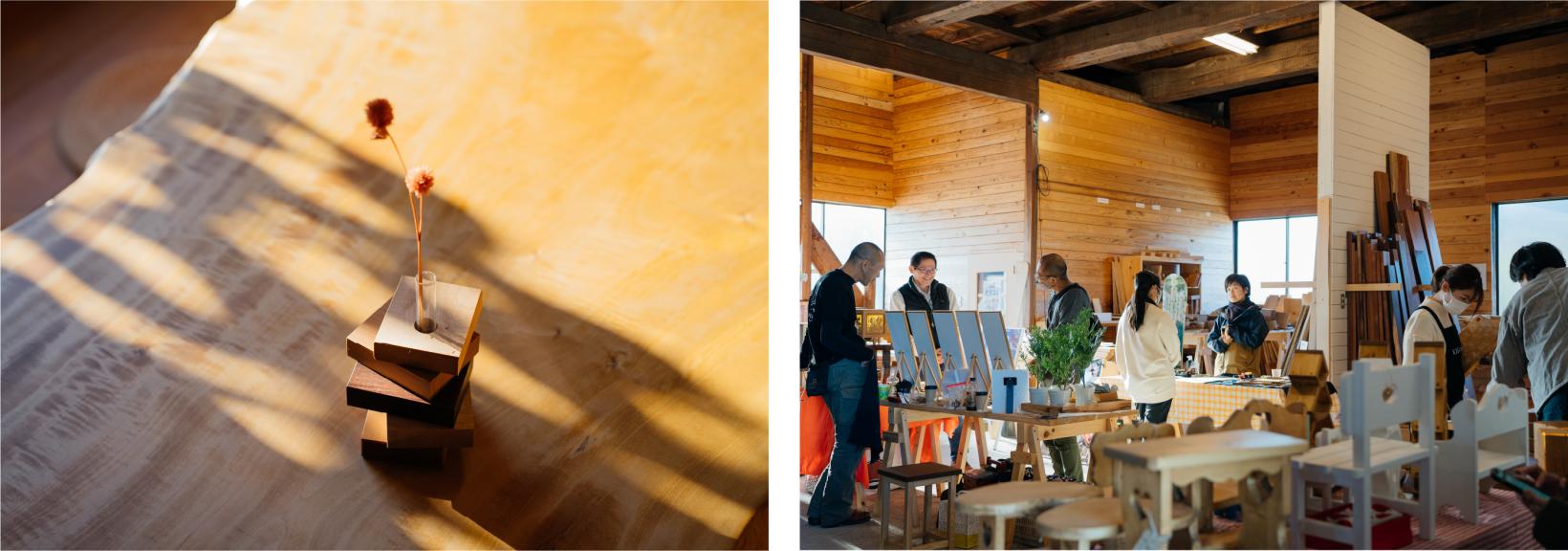富山県産材をはじめ、国内外の木材で作ったフラワーベースやカフェトレーなどが買えるショールームもあり、一般の方にもオープンな場所となっています。そこで年2回開催される「ウッドクラフトマルシェ」では、いろいろな作家の作品や食も楽しむことができ、いつも多くの人で賑わいます。木の魅力を身近に感じることができる素敵なスポットです。