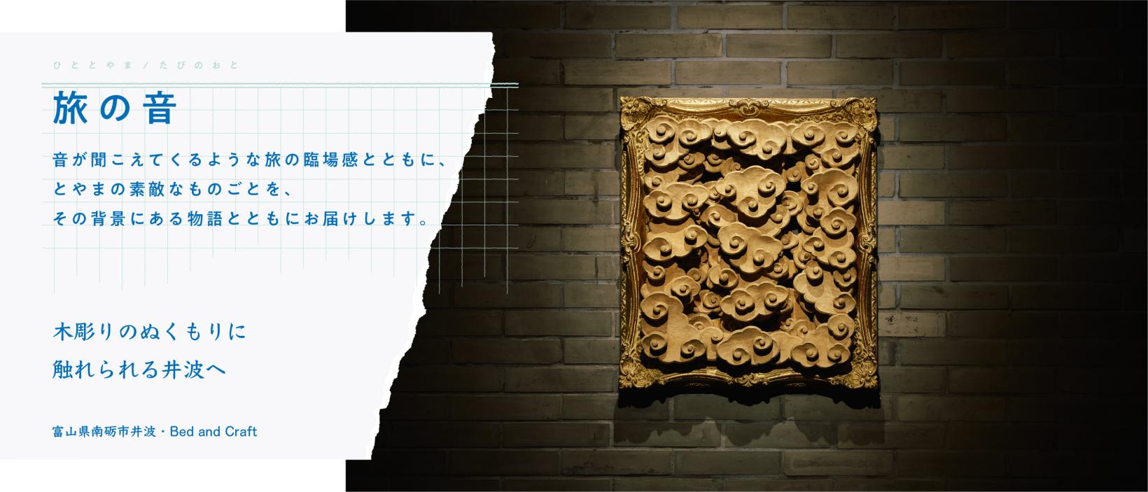 日本有数の木彫刻の産地、南砺市井波(なんとし いなみ)に降り立つと、ふわりと清涼感のあるいい香りに気付きます。その源は、井波彫刻の主な材料であるクスノキ。さらに「コンコン」と小気味よく響く木槌の音が、心満ちる旅へと誘います。