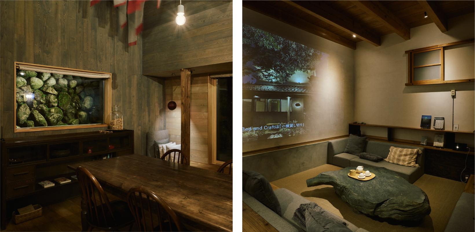 6つの宿泊棟はすべて1組1棟貸し切り。建具屋や料亭跡などの古い建物を活用し、その名残をほどよく残しつつ個性豊かにリノベーションしています。また、各棟で、彫刻家をはじめとする井波のさまざまなアーティストとのコラボレーションが実現しているのも興味深いところ。当地の歴史を感じ、作品を通じて地元作家のエネルギーにふれる特別な滞在が、旅を印象づけます。