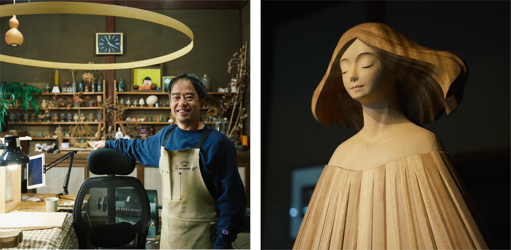 工房を訪ね歩く楽しさも井波の大きな魅力の一つ。「木彫・漆 トモル工房」では、木彫刻家の田中孝明(こうめい)さんと漆芸家の田中早苗さんが迎えてくれます。アトリエでは「Bed and Craft」を通じて孝明さんによるスプーン作りや早苗さんによる漆のワークショップも体験可能。普段、なかなか話す機会のない職人とのコミュニケーションによって、作品の世界をさらに深く知る喜びも感じることができるでしょう。