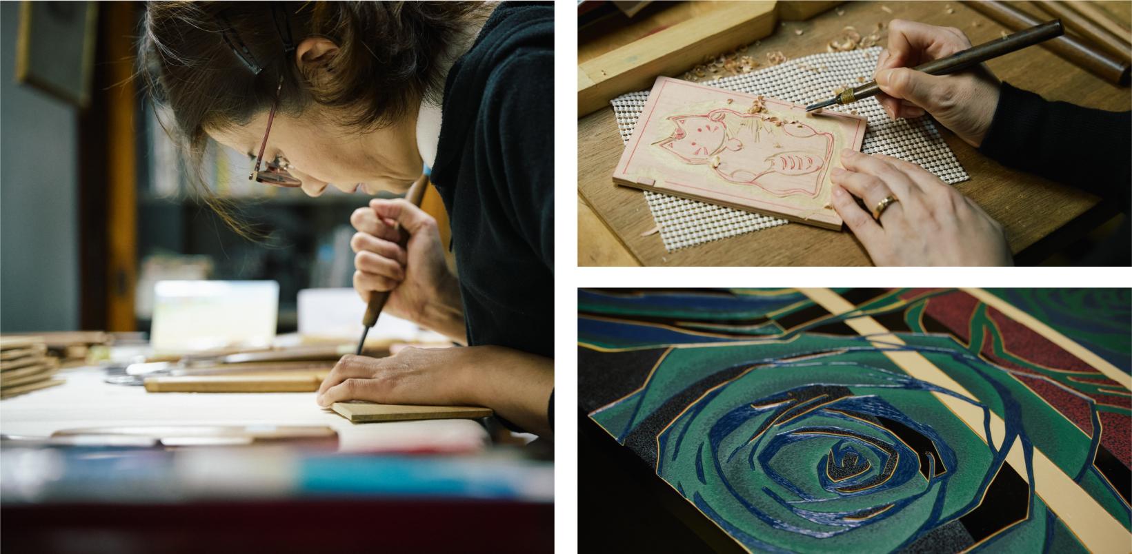 版画作りは、板に下絵をトレースし、5~10本ほどの彫刻刀を使い分けながら彫り進めます。色を載せて紙に写せば、年賀状などのオリジナルポストカードが完成。美しい中庭を眺めつつ、彫刻刀で板を彫る音に耳を傾けているうちにいつしか夢中に。3時間の体験時間はあっという間に過ぎていきます。