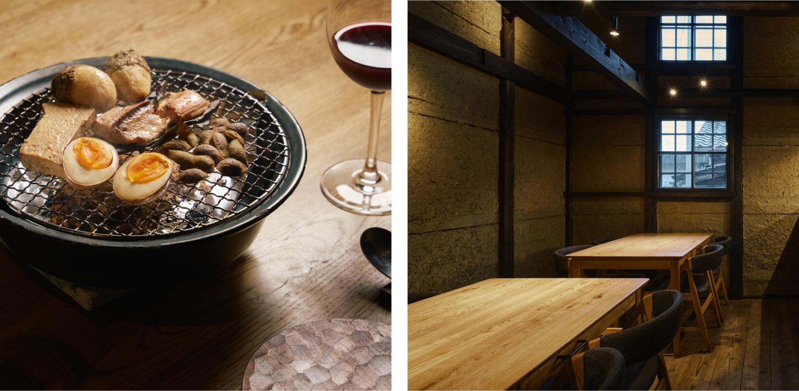 食のひとときでも当地の文化をしっかりと味わえます。路地裏の古い蔵跡を改装した「nomi」では、長崎・五島列島出身のシェフが腕をふるいます。木彫刻の際に出る木くずを使用した燻製料理を井波彫刻の器で提供。地元の食材のおいしさを丁寧に引き出した香り豊かな品々が評判です。