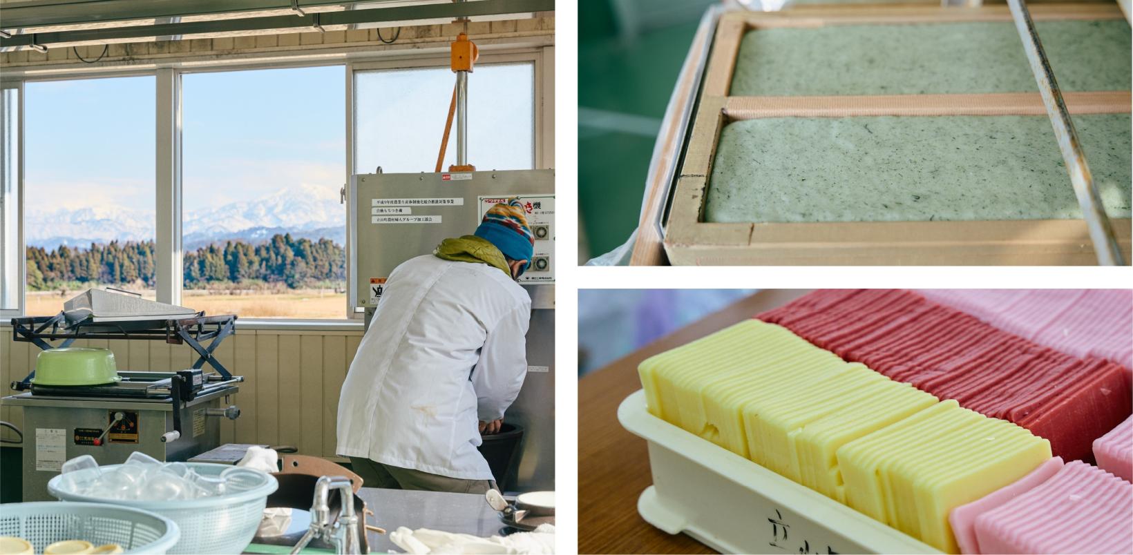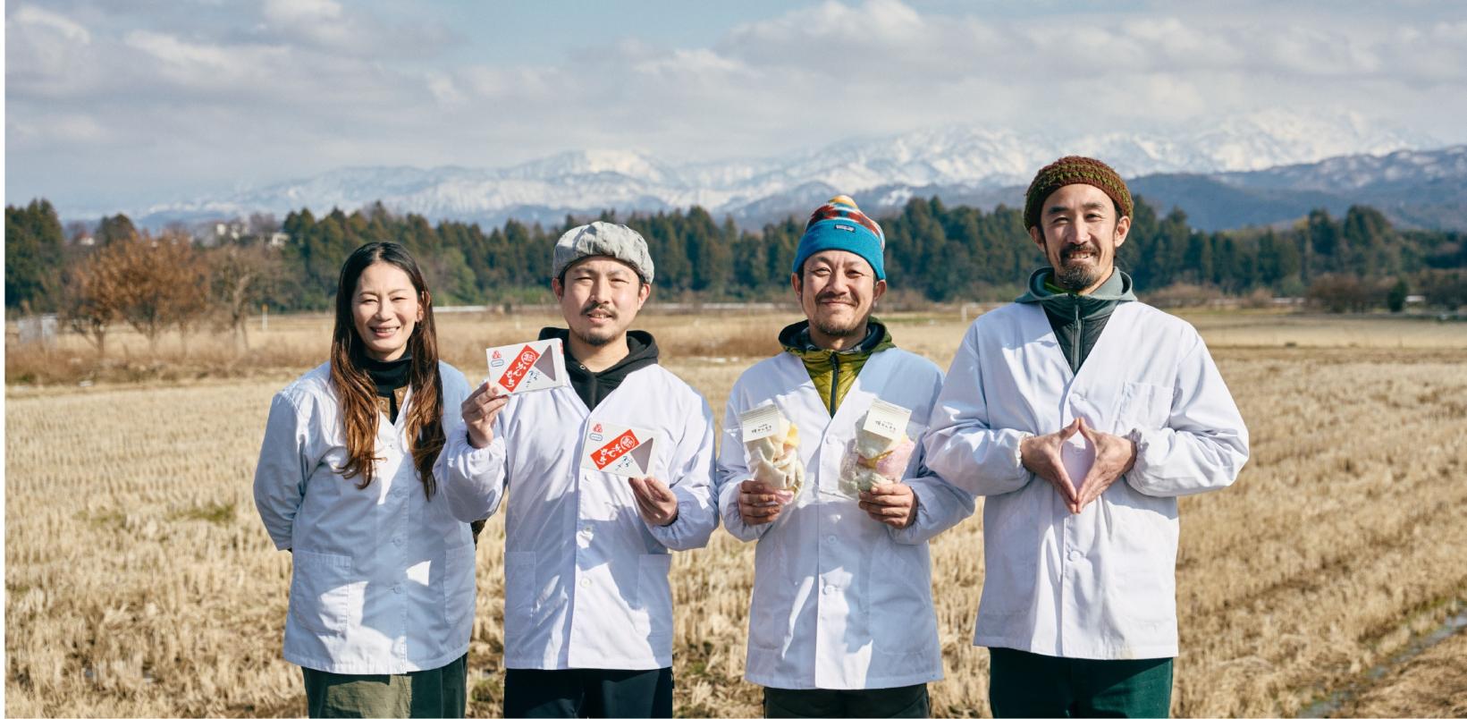実は「食彩工房たてやま」では2024年に、担い手不足や作り手の高齢化などの問題から寒餅作り継続の危機が訪れました。そこで、農業や大工などの本業のかたわら、地元のイベント設営などで町を盛り上げる活動をチームで手掛けていた北野貴紘(たかひろ)さん、森本肇さんらに白羽の矢が当たりました。生産者として、加工場を持つことで広がる可能性を感じたと北野さんは言います。「最初はただ工房の設備を引き継いでもらえないかということだったんですが、工房のお母さんたちからは、寒餅作りは大変だからやめておけと言われて……。でも、全国から寒餅の問い合わせを数多くいただいて、ここではやはり寒餅を作るべきだと思ったんです」。こうして働き盛りの有志8名が、それまで工房を支えてきた地元のお母さんたちに一から作り方を教えてもらいながら寒餅作りを受け継ぐことになったのです。