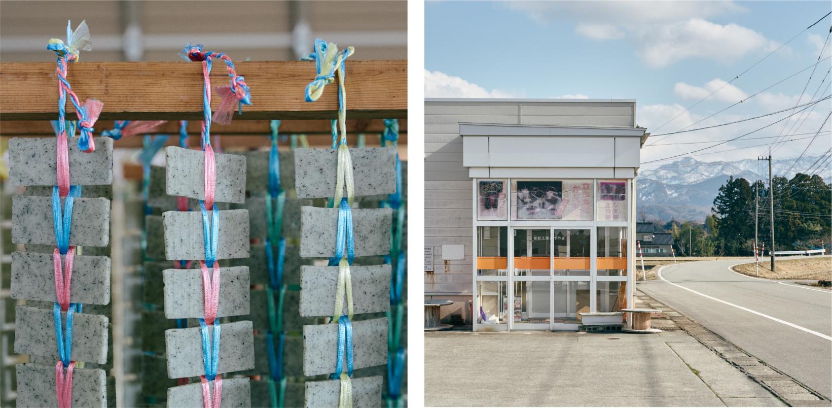 立山産のもち米「新大正もち」をはじめ、ヨモギや豆など餅に練り込む素材もほとんどが富山産。添加物を一切使わず、すべて天然のものだけで作ることにもこだわります。ついたばかりのやわらかい餅を型に入れて2日間かけて固めてから、厚さ5mm、縦5cm、横10cmの長方形に切りそろえて、10~15枚ほどずつ紐で縛って倉庫に吊るし、干します。約1カ月かけて、じっくり、ゆっくり干すことが肝心。早く乾きすぎると割れたりひびが入ったりすることも。逆に、あまりに乾燥が遅いとカビが生えてしまうのです。