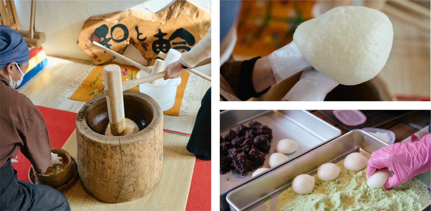 「餅は正月のようなハレの日に食べるものというふうに思っている方は多いですが、365日をハレの日にしてほしいという思いから始めました」と雅之さん。琴美さんが臼の餅を手早く返したら、「はいっ!」という掛け声に合せて、つき手が杵を振り下ろします。どんどん呼吸が合っていくとリズムに乗って餅をつく楽しさにいつしか夢中に。できあがった餅はその場で餡やきなこをつけて味わえます。つきたてのコシの強さと豊かな味わいがたまりません。