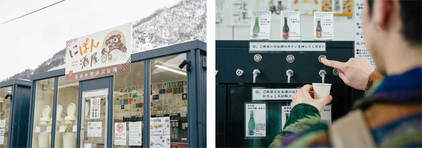 東京から夫婦で移り住んできて6年。僕のブランドの拠点である黒部は、自然も海の幸も素晴らしいし、おもしろいスポットも多いですね。宇奈月温泉駅前にある「にぽん酒屋」はお気に入りの一つ。ここは富山の地酒が飲める“無人試飲場”で、東京の友人たちが富山に遊びに来た時には、まずはここに立ち寄って歓迎します。試飲機に入れるコインをまずガチャガチャで買うというエンタメ性とワクワク感も魅力です。一杯で一口分くらいなので気軽に飲み比べできて、ほろ酔い気分で旅を楽しんでもらえます。1種類ずつ試飲できるのですが、ちょっぴりお得な3種類の試飲を選ぶことが多いかな。
