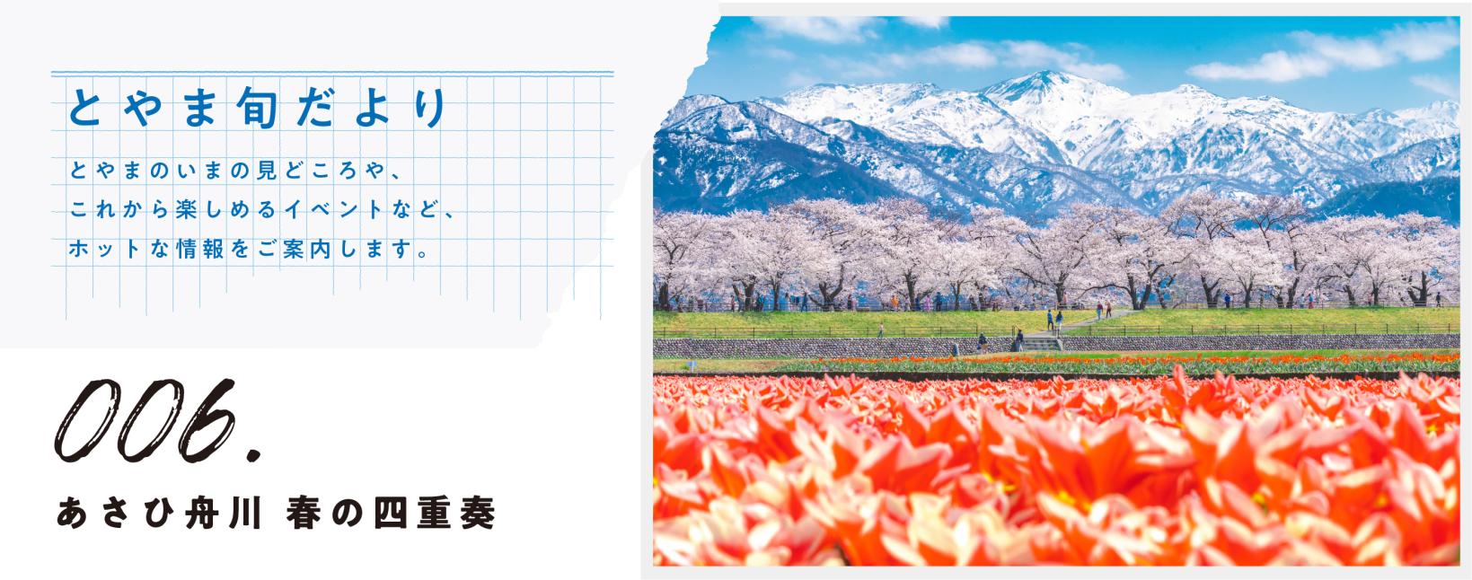 富山県朝日町の舟川べりが色とりどりに染まるイベントあさひ舟川 「春の四重奏」。約1,200mにわたる桜並木、鮮やかな彩りのチューリップ、黄金色に輝く菜の花、そして残雪の北アルプス、この4つの景色が織りなす奇跡のような絶景で魅了します。