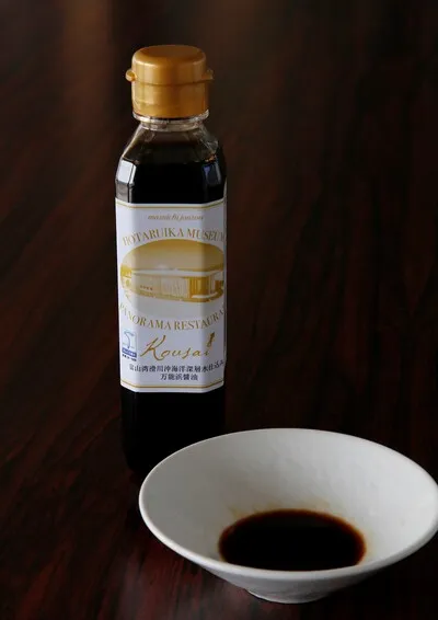 滑川沖の海洋深層水で仕込んだしょうゆ。ほたるいかミュージアム併設の「パノラマレストラン 光彩」と富山市の「マスイチ醸造」が開発したオリジナル商品です。