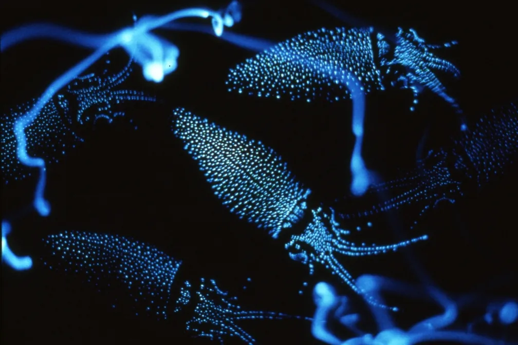 ホタルイカの発光ショーでは、本物のホタルイカが青白く発光する様子を間近で見学することができます。3月下旬〜5月下旬以外は、“龍宮ホタル”(深海に棲む発光性プランクトン)の発光ショーが開催されますよ。