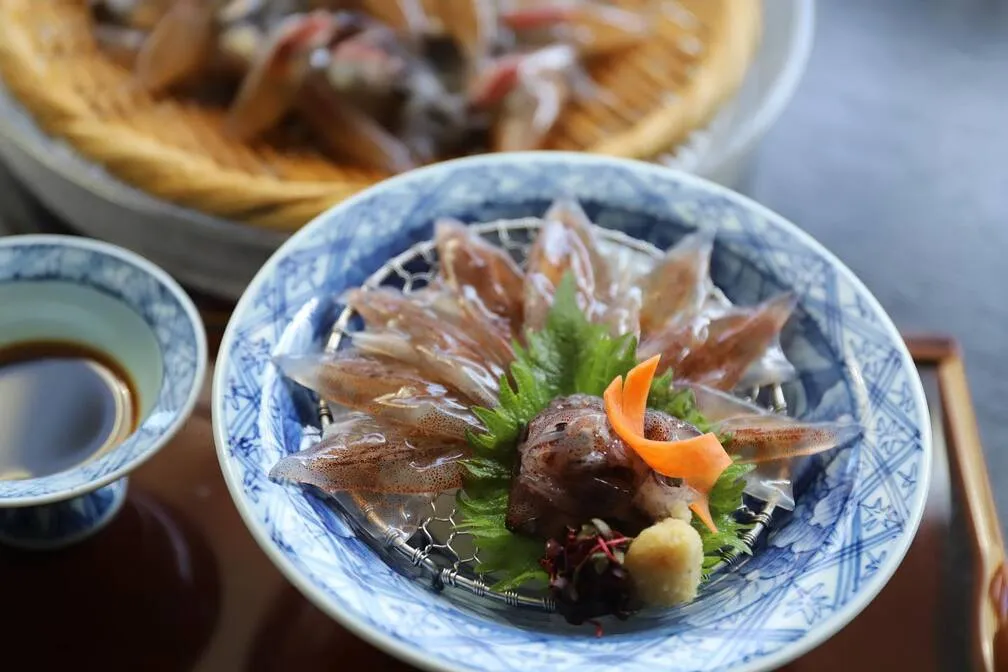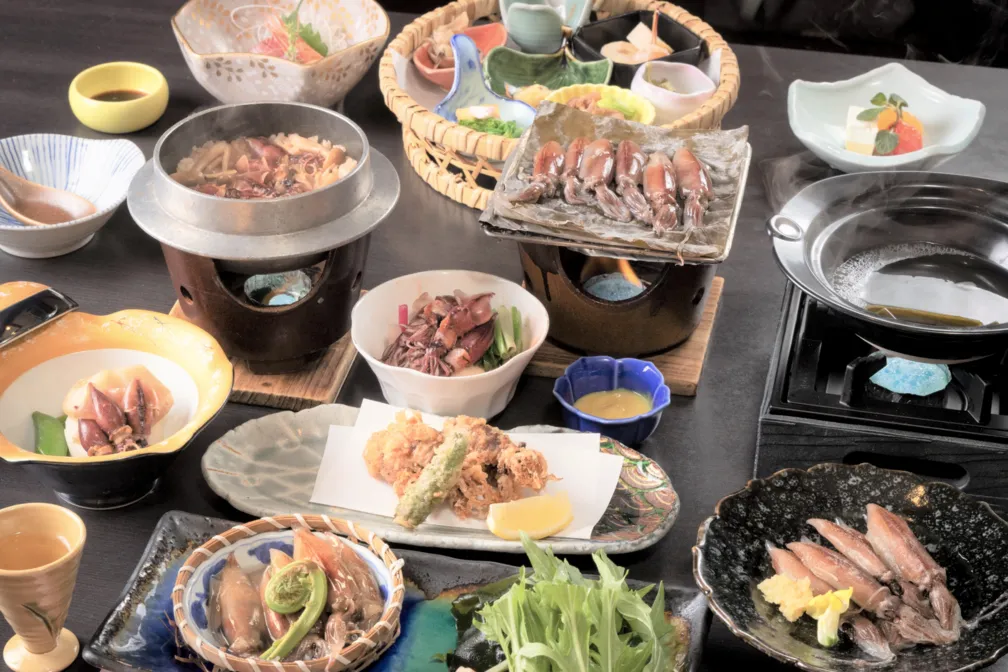 子宝の湯で有名な温泉地・北山鉱泉に佇む温泉旅館。3月〜5月には「ほたるいか三昧プラン」が登場します。刺身や昆布焼き、「しゃぶしゃぶ風釜揚げ」などが並び、ホタルイカを味わい尽くすことができます。