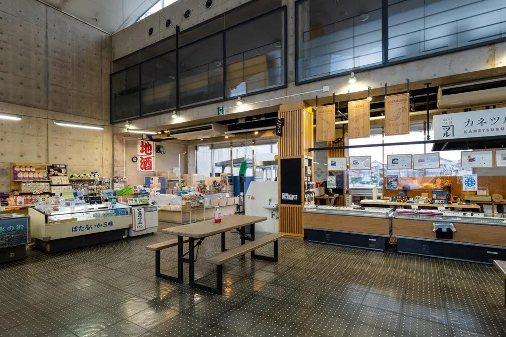 「ほたるいかミュージアム」やレストラン・カフェ、観光案内所などが併設する複合施設(滑川市)。「おみやげマーケット」で、ホタルイカを使ったお土産各種や「万能浜醤油」などを購入することができます。