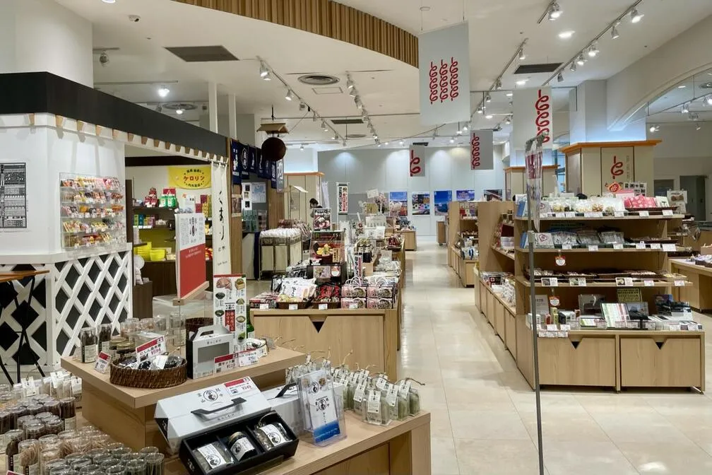 富山駅前のビルに入る物産コーナー。富山の特産品を豊富に取り揃えます。レギュラー商品の他、食べ切りサイズの「越中富山 幸のこわけ」ブランドも人気。ホタルイカの浜干しや燻製、ギフトセットも用意します。