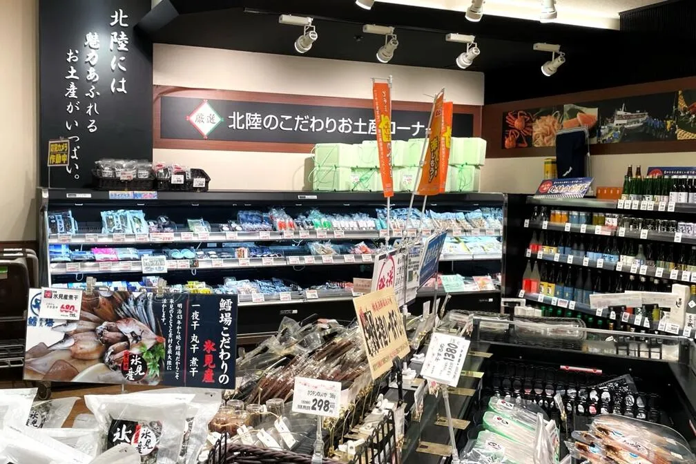 電鉄富山駅の駅ビル「エスタ」地下1階に広がるスーパーマーケット。野菜や鮮魚コーナーに加え、お土産コーナーもあり、素干しなどホタルイカの加工品を手に取ることもできます。