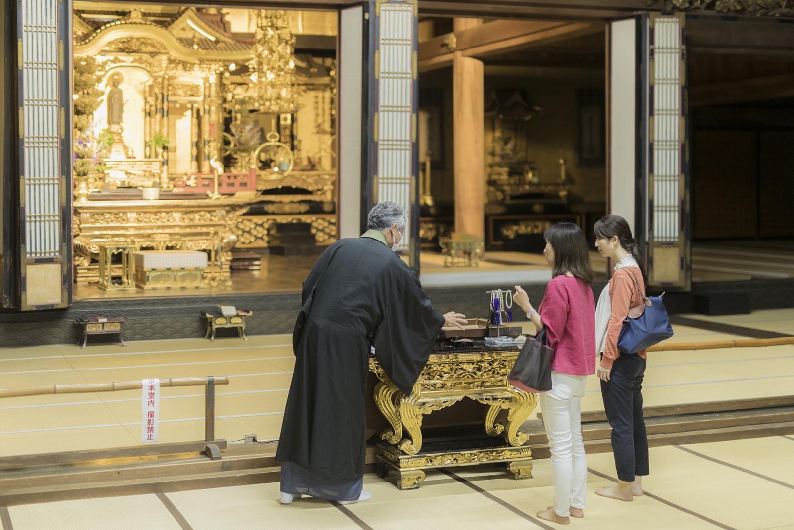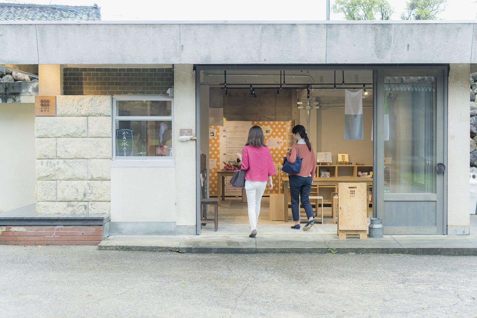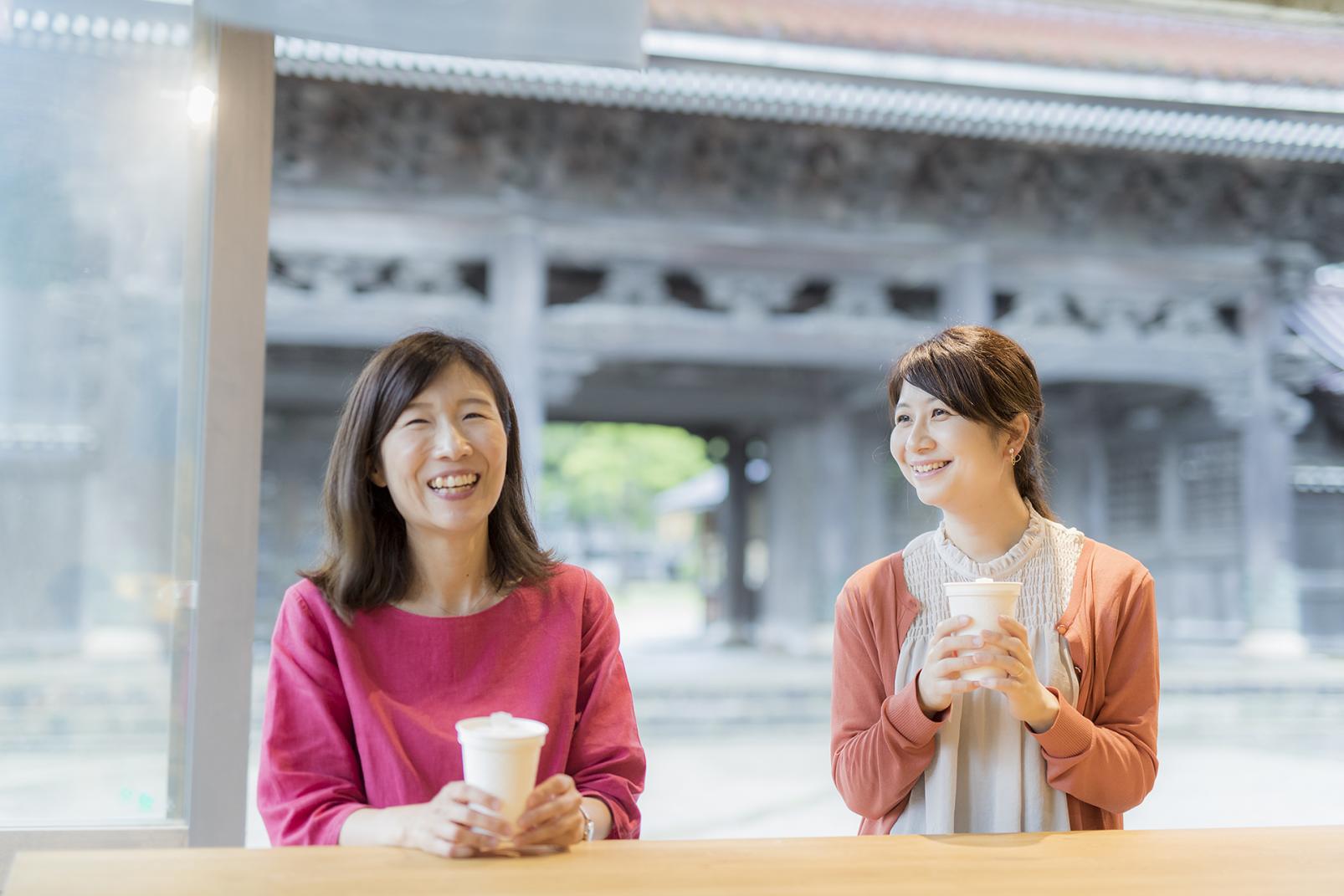 「瑞泉寺」の大門(山門)の目の前にある「テラまち雑貨店」では、「瑞泉寺」や木彫の町の魅力を広める商品を扱っています。数珠玉をモチーフにしたアクセサリーは、瑞泉寺の古木を材料に井波彫刻師が手作りしています(オーダー制)。また、瑞泉寺のおこりを分かりやすく紹介している絵本や、綽如上人(しゃくにょしょうにん)の袈裟(けさ)の模様をデザインした手ぬぐいもあります。テイクアウトのコーヒーは、近くの焙煎所の豆を使って淹れています。