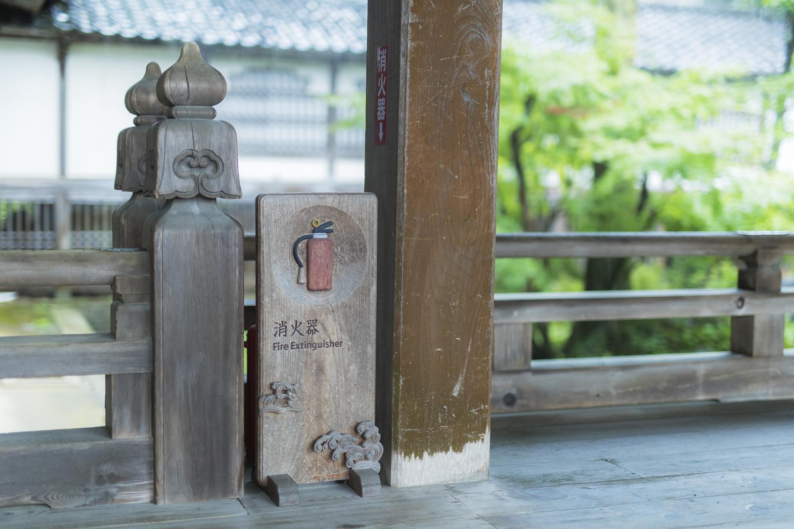 現在の本堂は1885年に建立されたもので、木造建築の寺院としては北陸最大級の建物です。また、太子堂は日本最大級の木造建築として1918年に出来上がりました。特に太子堂は、井波の大工や彫刻師の優れた技が発揮されています。なかでも屋根を支えている「手挟み(たばさみ)」は精緻な造りで、一本の木から掘り出されているそうです。ほかにも、間口が約20m、高さ17mもある総ケヤキ造りの大門(山門)の彫刻も素晴らしく、龍や天女が彫刻されています。寺院のあちらこちらで見かける消火栓やトイレを案内する看板も、井波彫刻師の手によるものです。