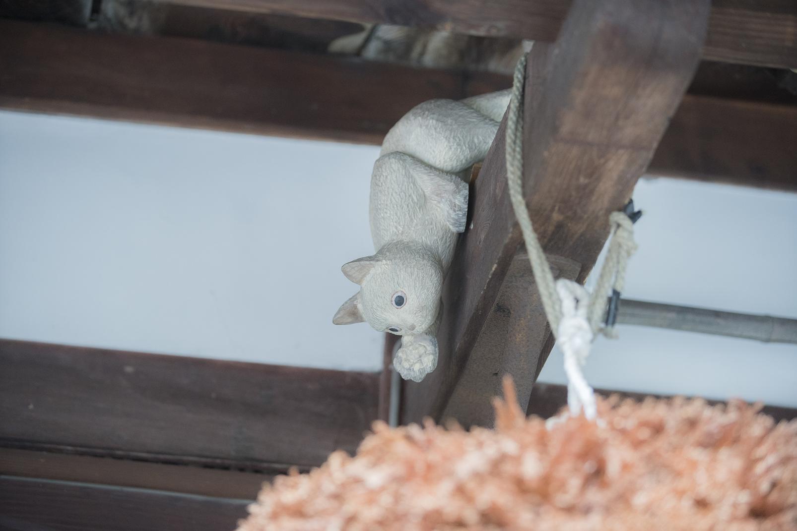 八日町通りでは、軒下や窓辺などいろんな場所で木彫りの猫がくつろいでいます。制作しているのは、もちろん井波の彫刻師たち。猫がお酌をしていたり昼寝をしていたり、仕草や表情も個性的です。八日町通りのいろんな場所やお店に「木彫りにゃんこお散歩マップ」が置いてあるので、マップを片手に猫を探しながら町をめぐるのも楽しそうですね。約30匹の猫がいるので、ぜひ見つけてみてください。