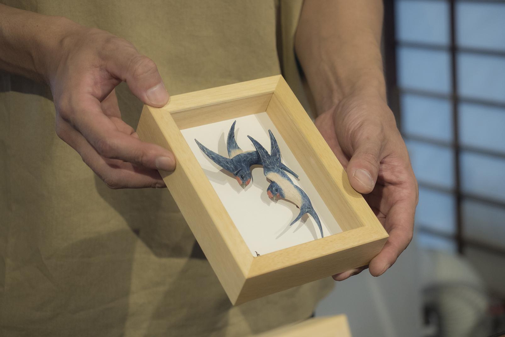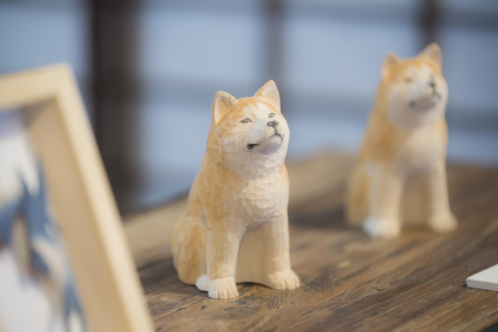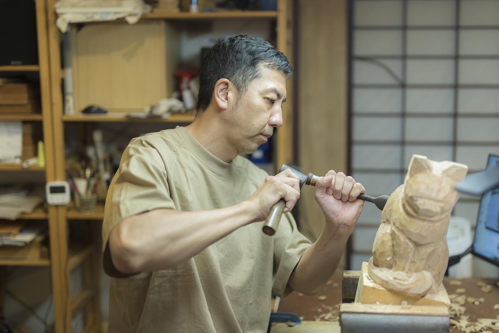 八日町通りには彫刻師の工房が何軒もあり、見学もできます。瑞泉寺のすぐ近くにある「塔(とう)」は彫刻師・池田塔さんの工房で、足を踏み入れると木の香りに包まれます。作品を展示・販売するスペースの奥が工房で、200〜300本の鑿(のみ)を使い分けながら木を彫っています。「ほかの道具に頼らずに鑿(のみ)だけで艶やかに仕上げるのが井波の技術です」と池田さん。動植物をモチーフにした作品を多く生み出していて、一緒に暮らす猫をモチーフにすることも多いと言います。