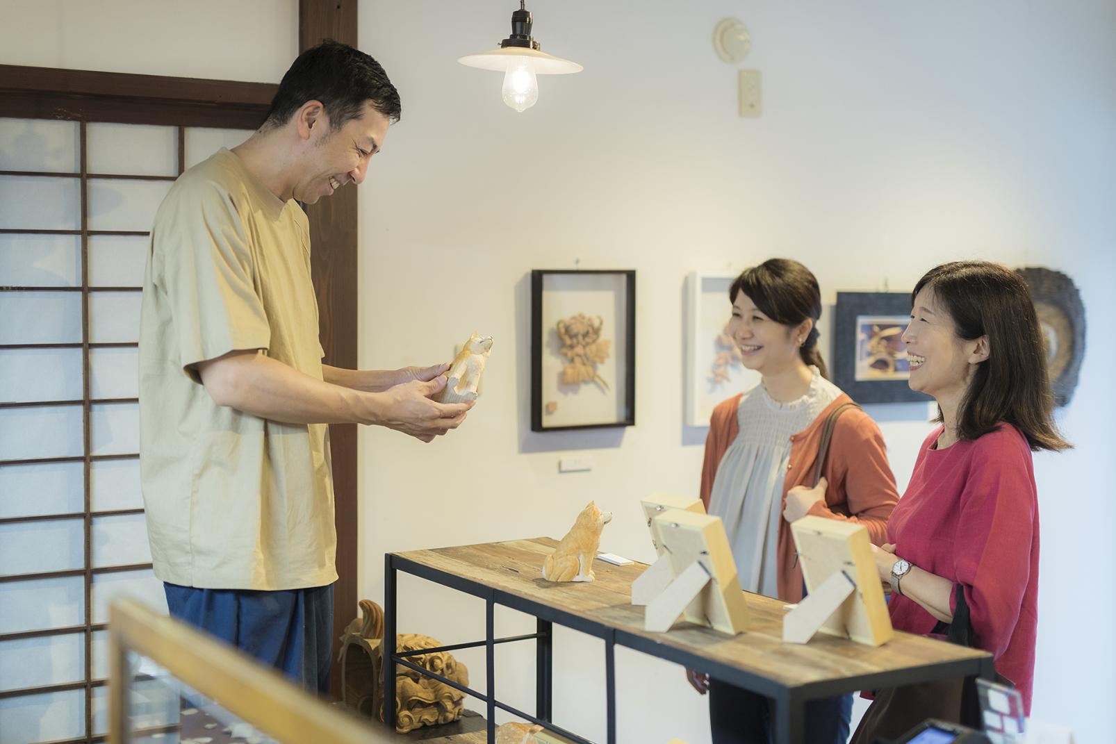 彫刻師の工房で、制作風景の見学とお土産探し