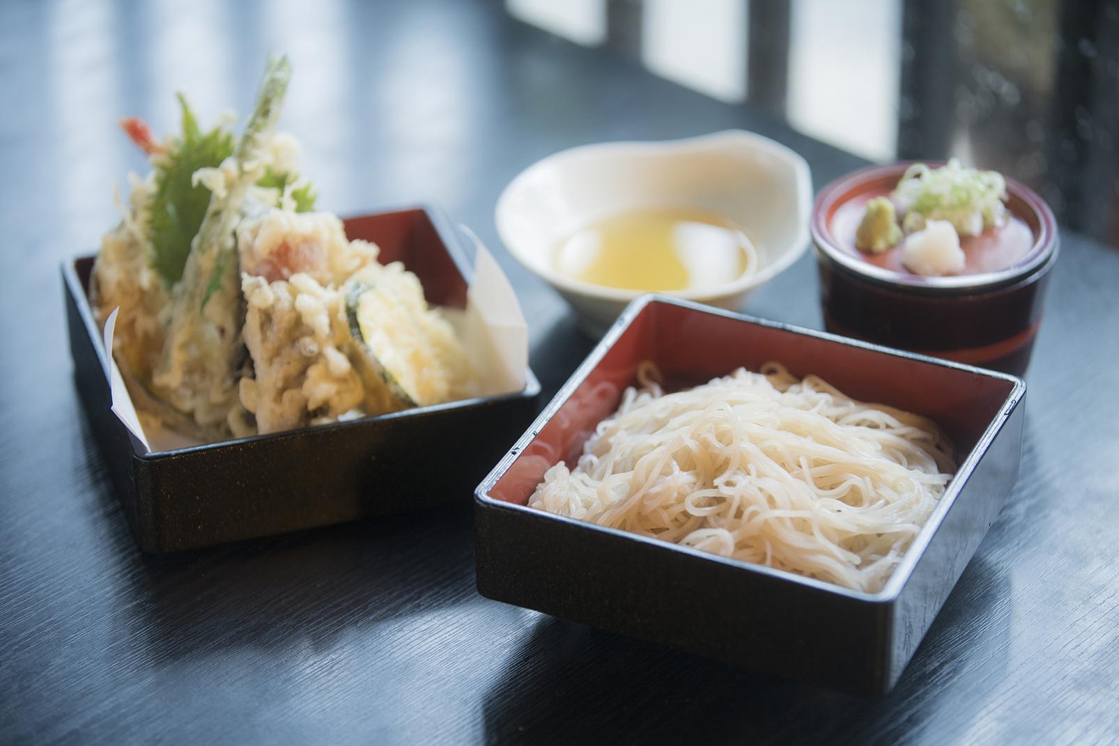 大正元年に創業した「松屋」は、季節の山菜や野菜を揚げた天ぷらが評判で、手打ち蕎麦とセットになったメニューが人気のお店です。