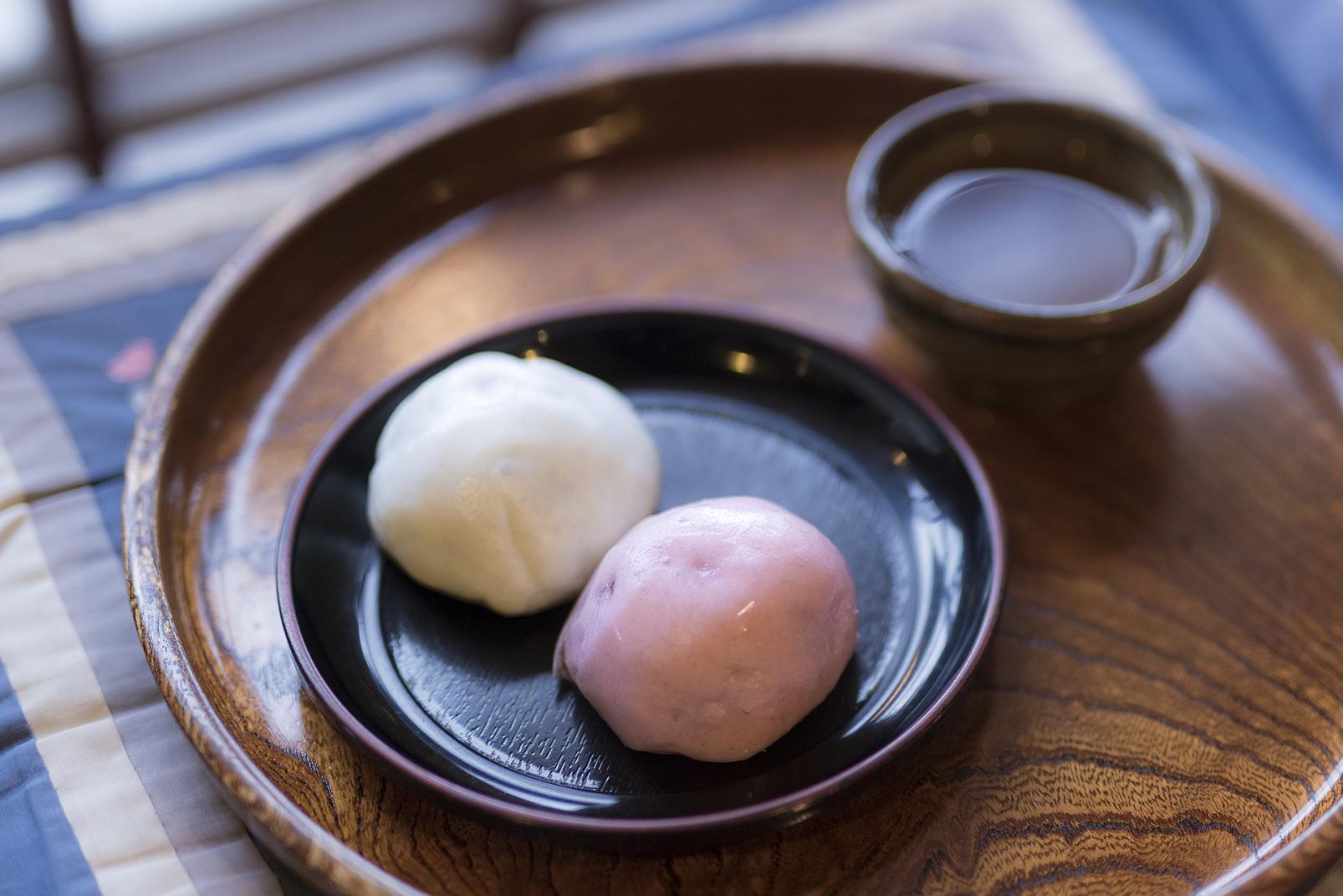 「田舎まんじゅう よしむら」の田舎まんじゅうは井波で定番のお土産で、もうすぐ発売から60年を迎えます。山に初雪が降った姿を映し、薄皮生地の表面からは粒あんがたっぷりと包まれているのが透けて見えます。考案した三代目の吉村さんは「あっさりとした甘さにするために、氷砂糖を使って小豆を炊くのがこだわり」と話します。店先で食べる人には、お茶のサービスも。店内には一本彫りの立体彫刻やからくりなど、めずらしい彫刻も飾られています。