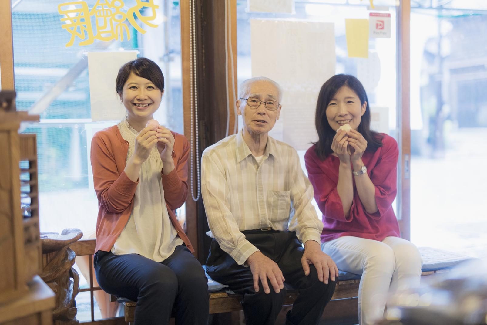 三代目店主の吉村健治さんは、自慢の「田舎まんじゅう」の誕生秘話を、はつらつとした名調子で語ってくれます。常連客の中には、吉村さんとの会話を楽しみに訪れる人も多いよう。地元の人との会話が、心に残る旅の思い出になりそうですね。