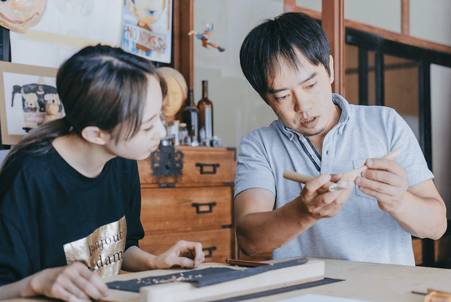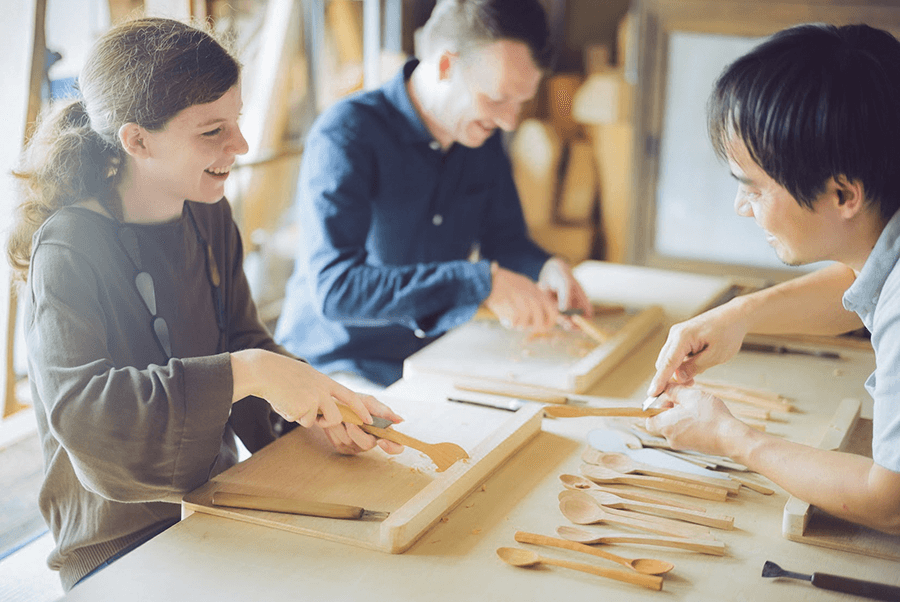 「Bed and Craft」の楽しみは、泊まる(=Bed)だけではありません。職人の工房に直接訪れて、自分だけのオリジナル作品を制作できるワークショップ(=Craft)も用意されています。木彫刻家・田中孝明さんに弟子入りするコースでは、井波彫刻の技術を使って、一枚のサクラの木から自分の好きな形のスプーンを彫り出します。
