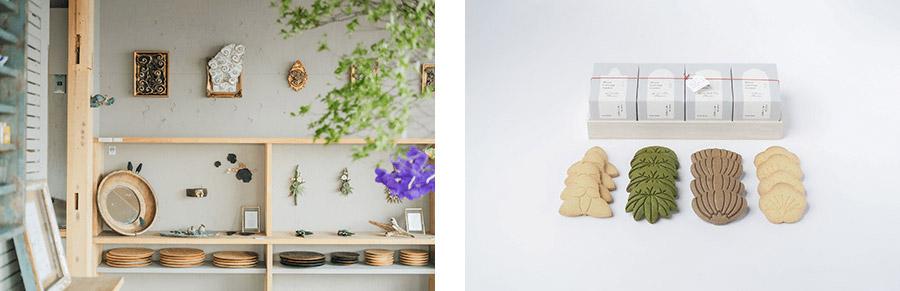 木彫の町 井波に泊まった記念の品を購入するなら、2020年にオープンしたショップギャラリー「季の実」へ。店内に入って右側のスペースに、器やアクセサリー、壁飾りなど、井波の職人たちの個性豊かな作品がセンスよく並んでいます。自分が泊まった宿に飾られていた職人の作品にも出会えるかもしれません。