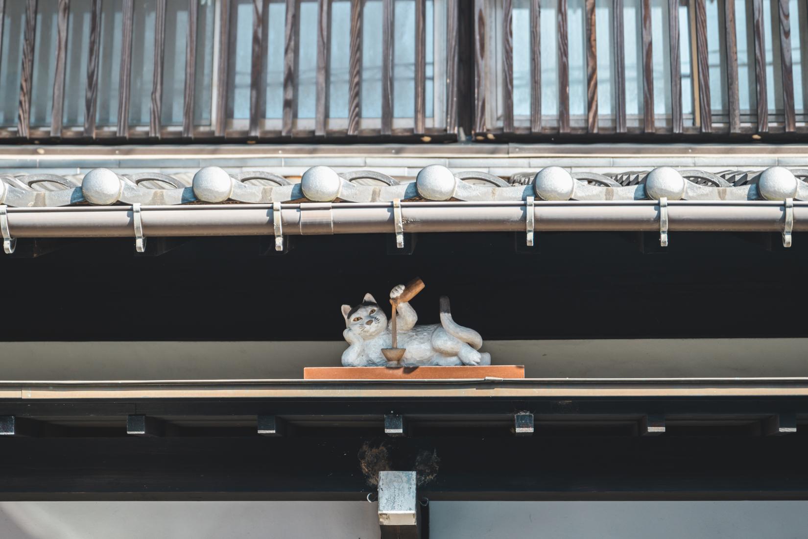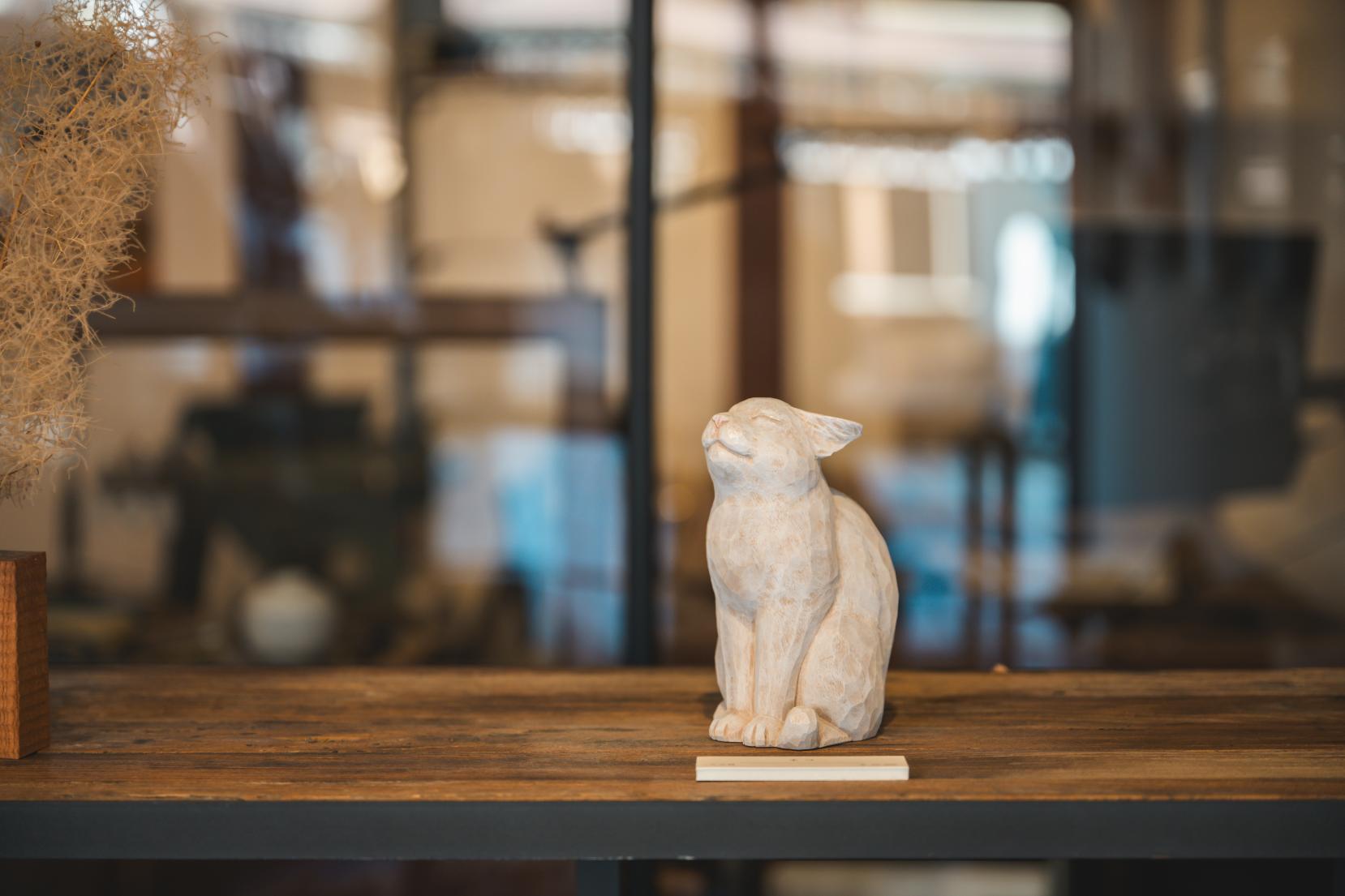 工房では彫刻作家の作品を購入することもできます。八日町通りの軒下や窓辺などいろんな場所で木彫りの猫がくつろいでいます。制作しているのは、もちろん井波の彫刻師たち。猫がお酌をしていたり昼寝をしていたり、仕草や表情も個性的です。八日町通りのいろんな場所やお店に「木彫りにゃんこお散歩マップ」が置いてあるので、マップを片手に猫を探しながら町を散策するのがおすすめ。