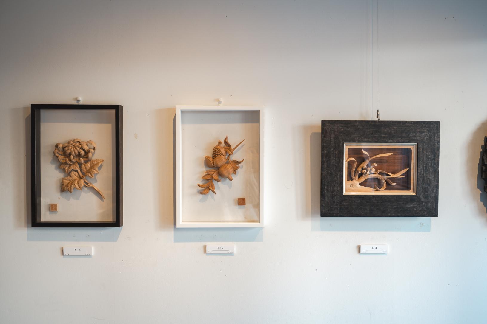 井波エリアの街の中心にある八日町通りには、数多くの井波彫刻の工房が軒を連ね、木の香りや数々の彫刻作品が人々の目を楽しませてくれます。通りを歩けば、木彫りのバス標識や表札など、随所に伝統技術を用いた美しい井波彫刻を見ることができます。