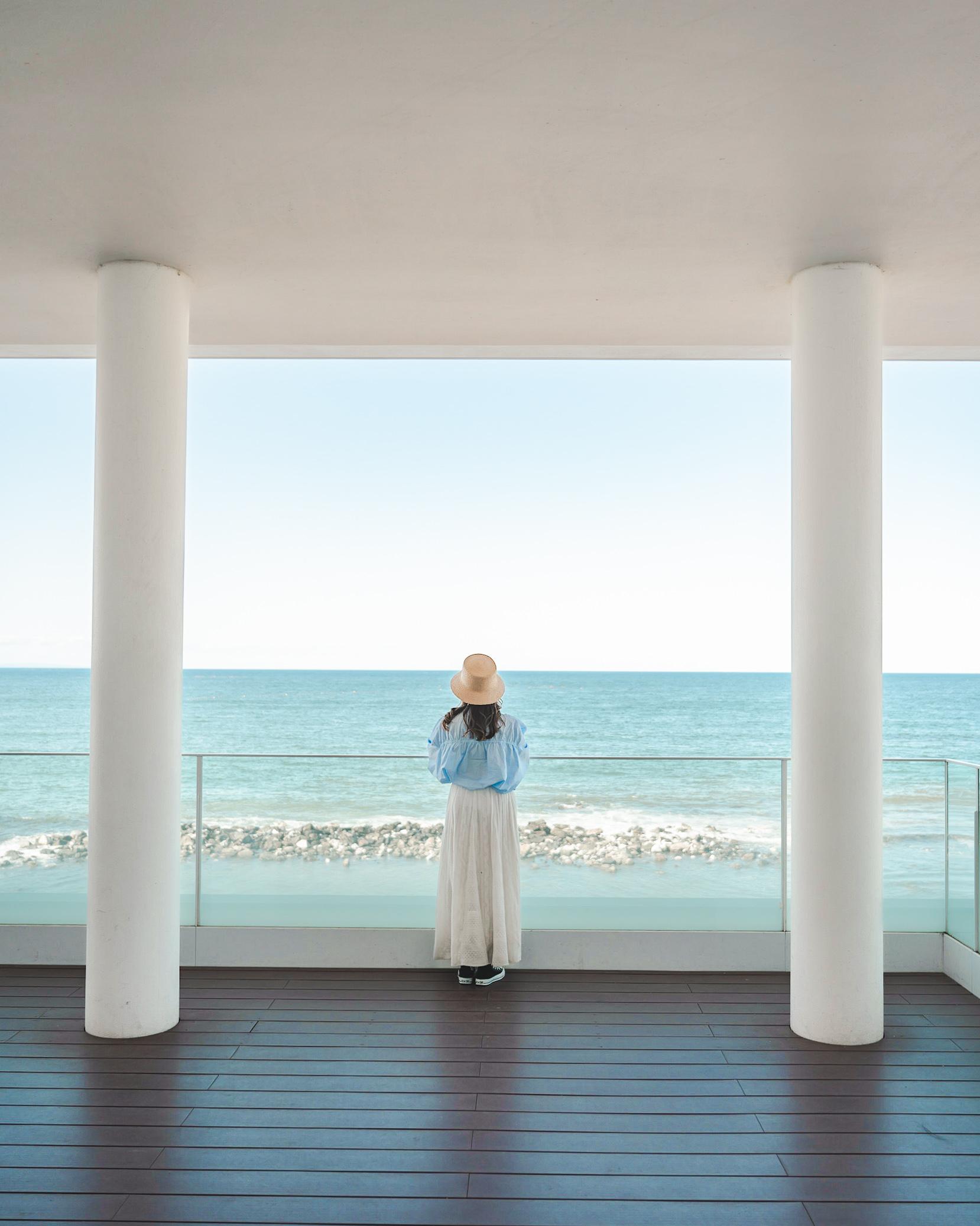 雨晴海岸沿いに建つ、船の形をモチーフにしたという真っ白でモダンな建物、道の駅「雨晴」。