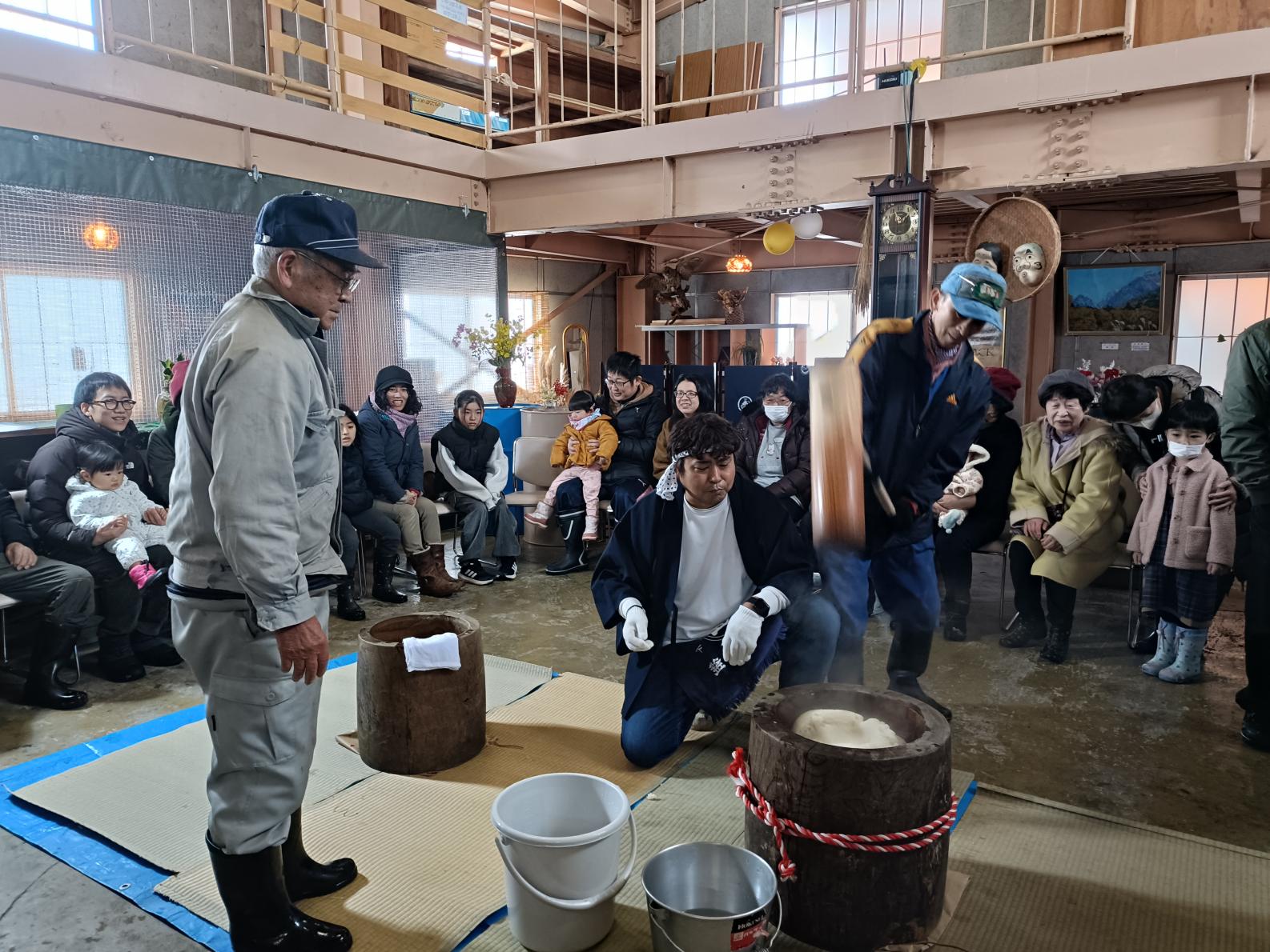 村井さんが開始を知らせると、御年88歳の桑原米蔵さんが初打ちを行い、餅つき大会がはじりました。使うもち米はもちろん立山町産、杵と臼も地域内で準備できたそうです。