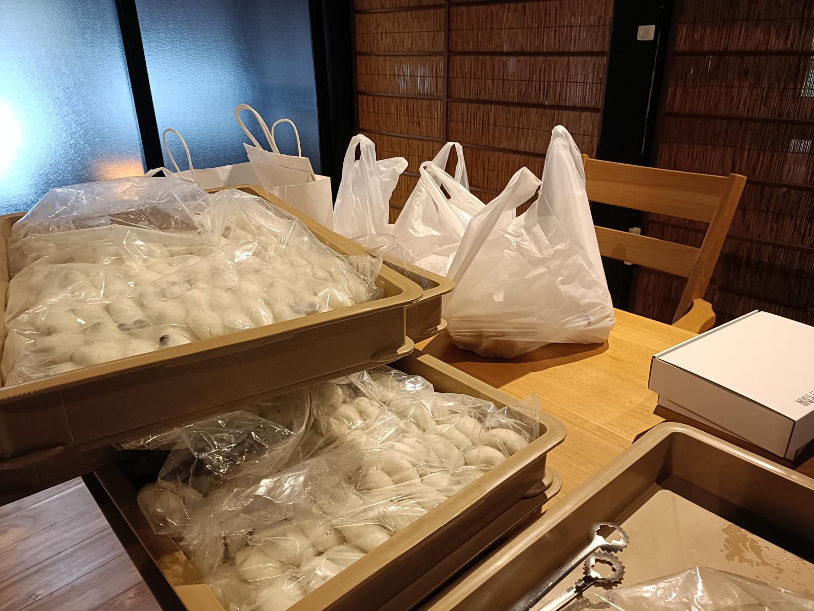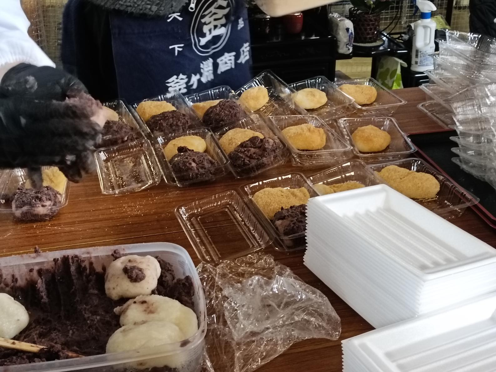 つきあがった餅は、加工スペースでちょうどよい大きさに分けられ、あんこときなこの2種類の餅を作っていきます。希望者にはぜんざいも準備してくれるようでした。