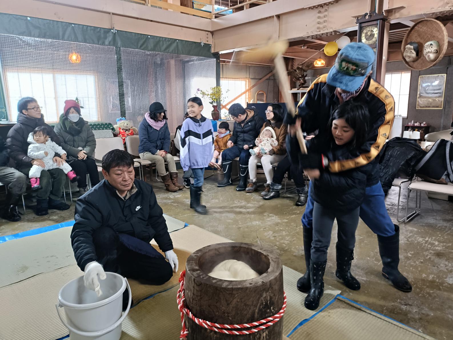 餅をつく度に、どこからともなく「よいしょ」というかけ声が聞こえます。地域の方々が絶え間なく交代しながら、餅つきはリズミカルに進んでいきます。子供たちが杵を持って餅をつく体験も楽しそうに行われていました。