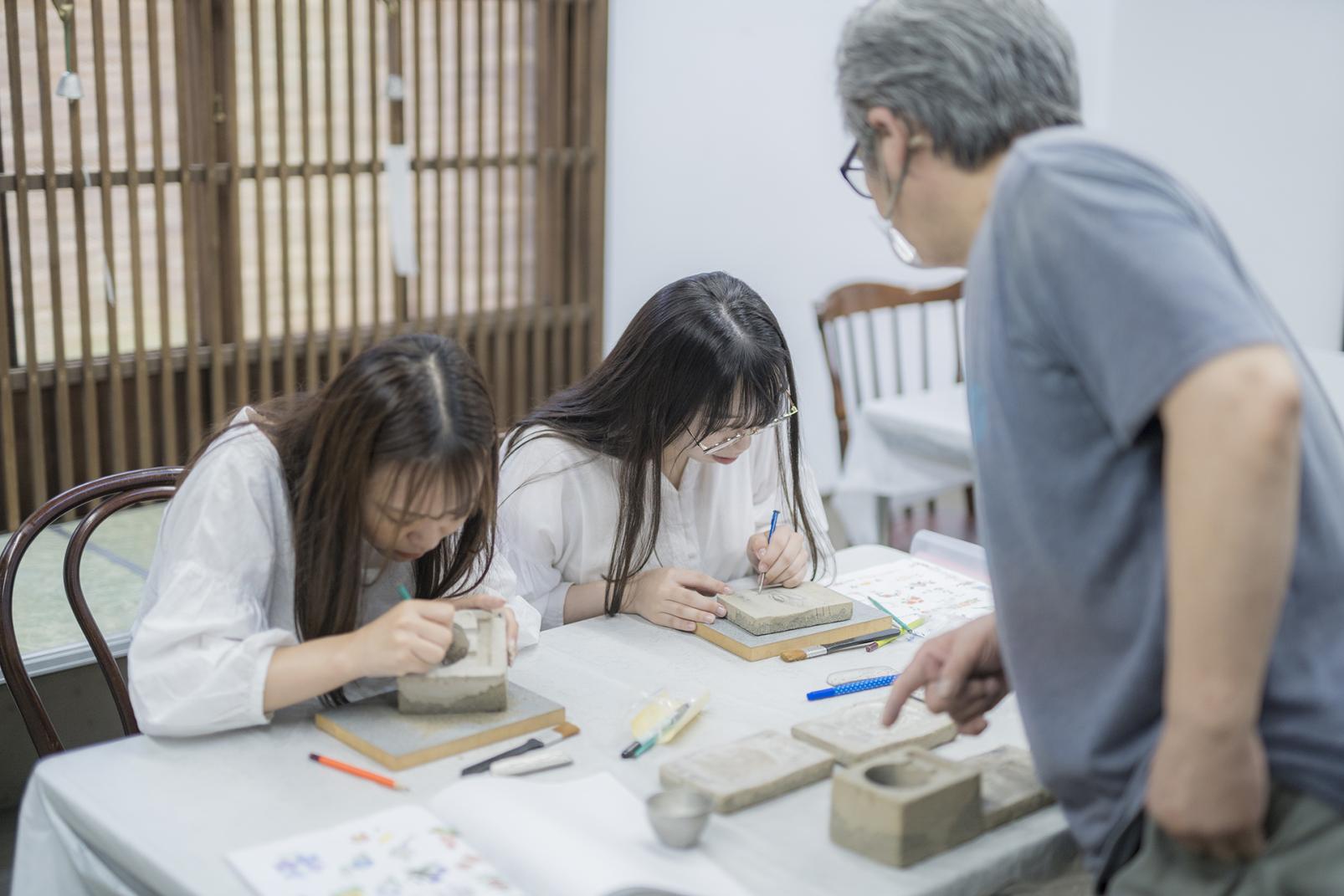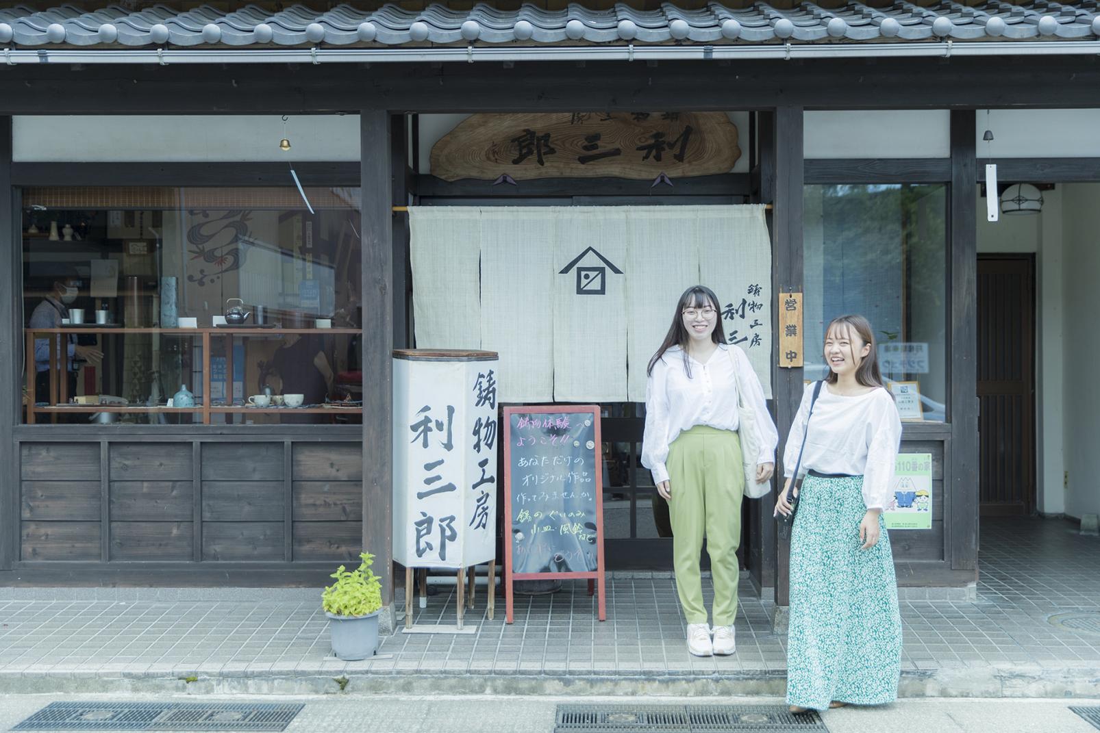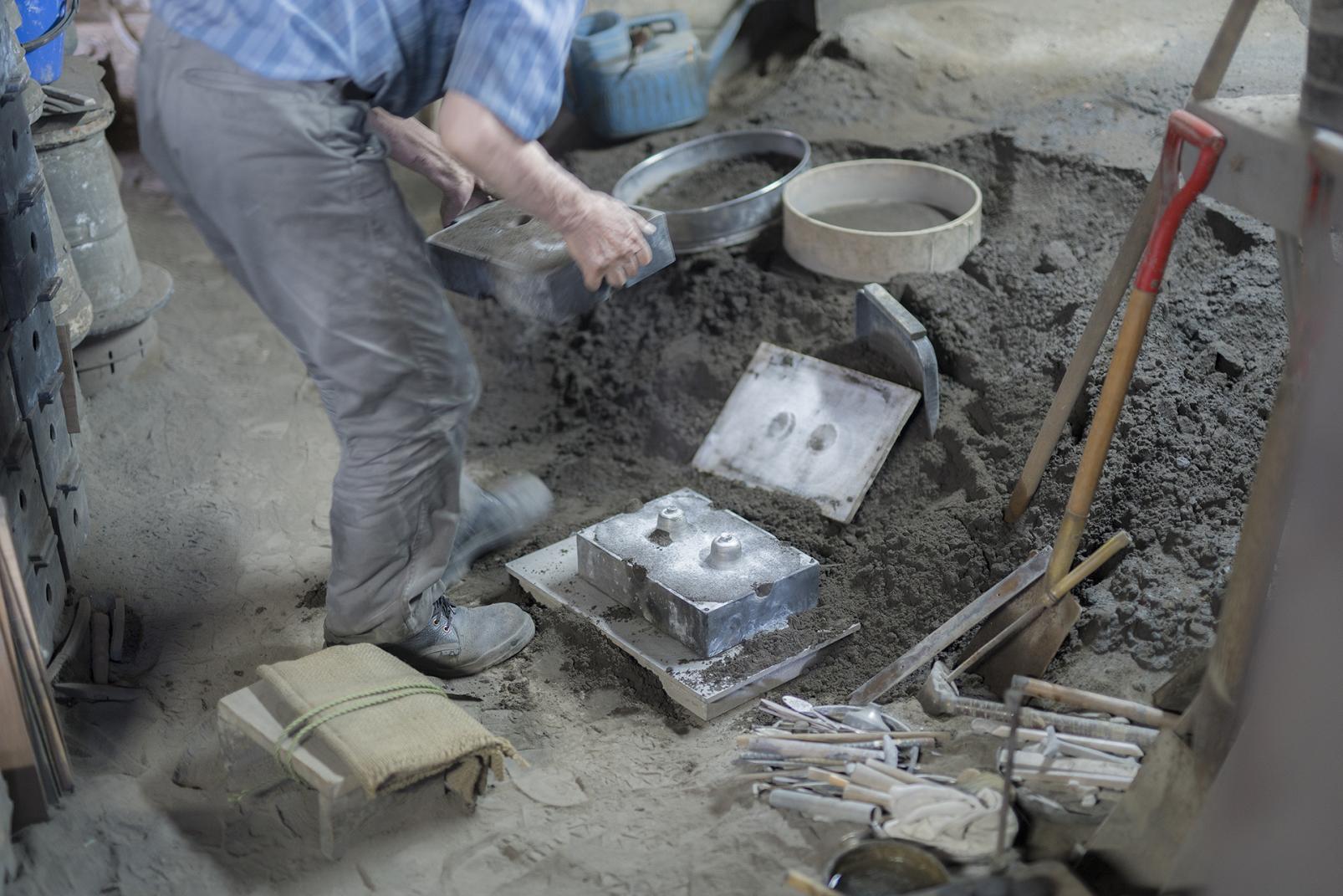 「鋳物工房 利三郎」は、現在も金屋町で鋳込みをする数少ない工場です。事前にお願いしておけば、体験の合間にお店の奥にある工場を見学させてもらうことができます。高岡銅器伝統工芸士にも認定されている店主の神初さんが、双型や砂型といった高岡の職人が受け継いできた伝統的な鋳造方法を、実際に使う道具を手にして説明してくれます。