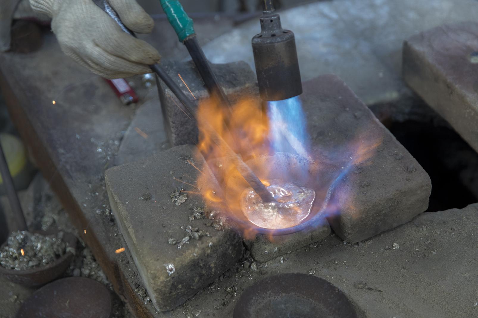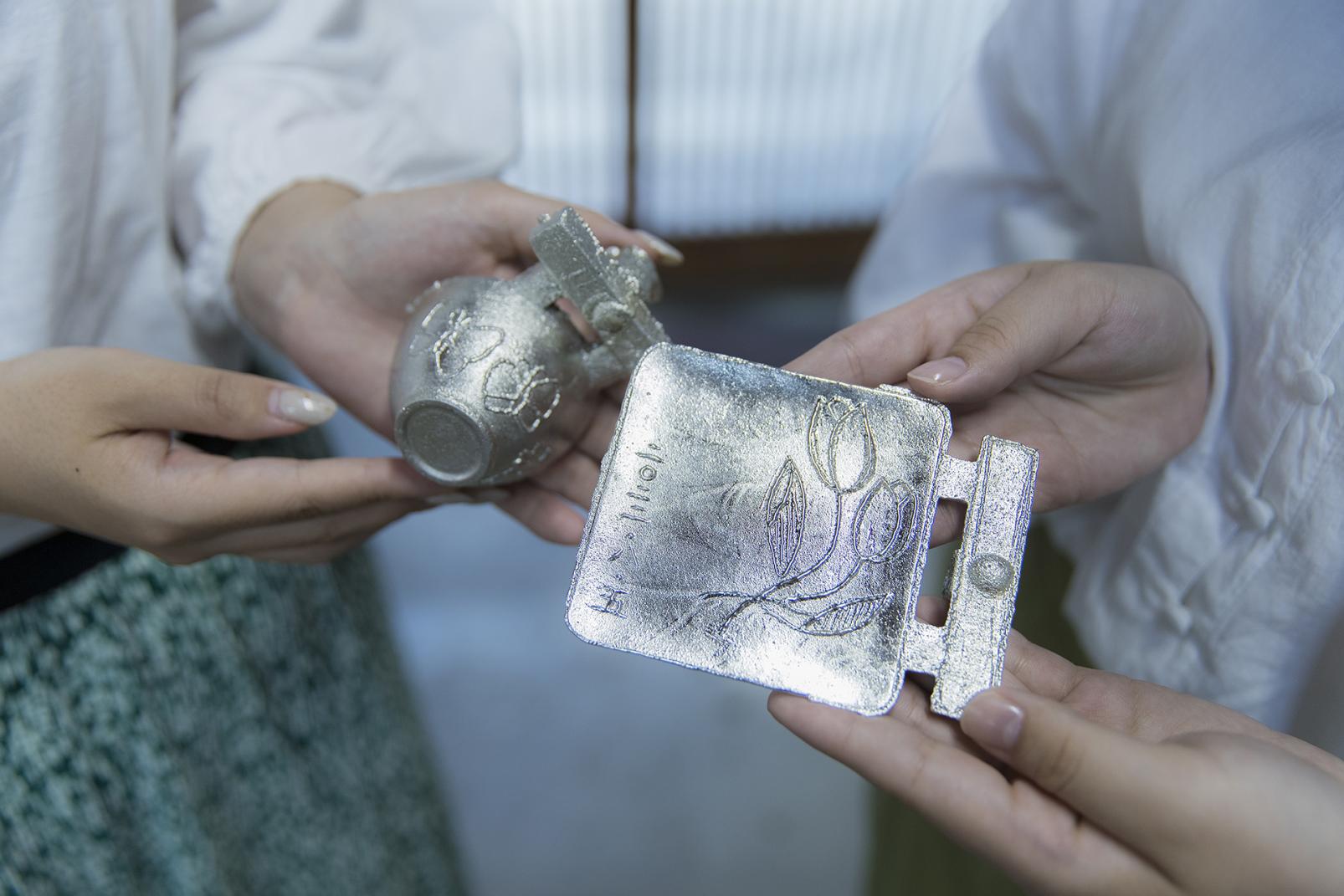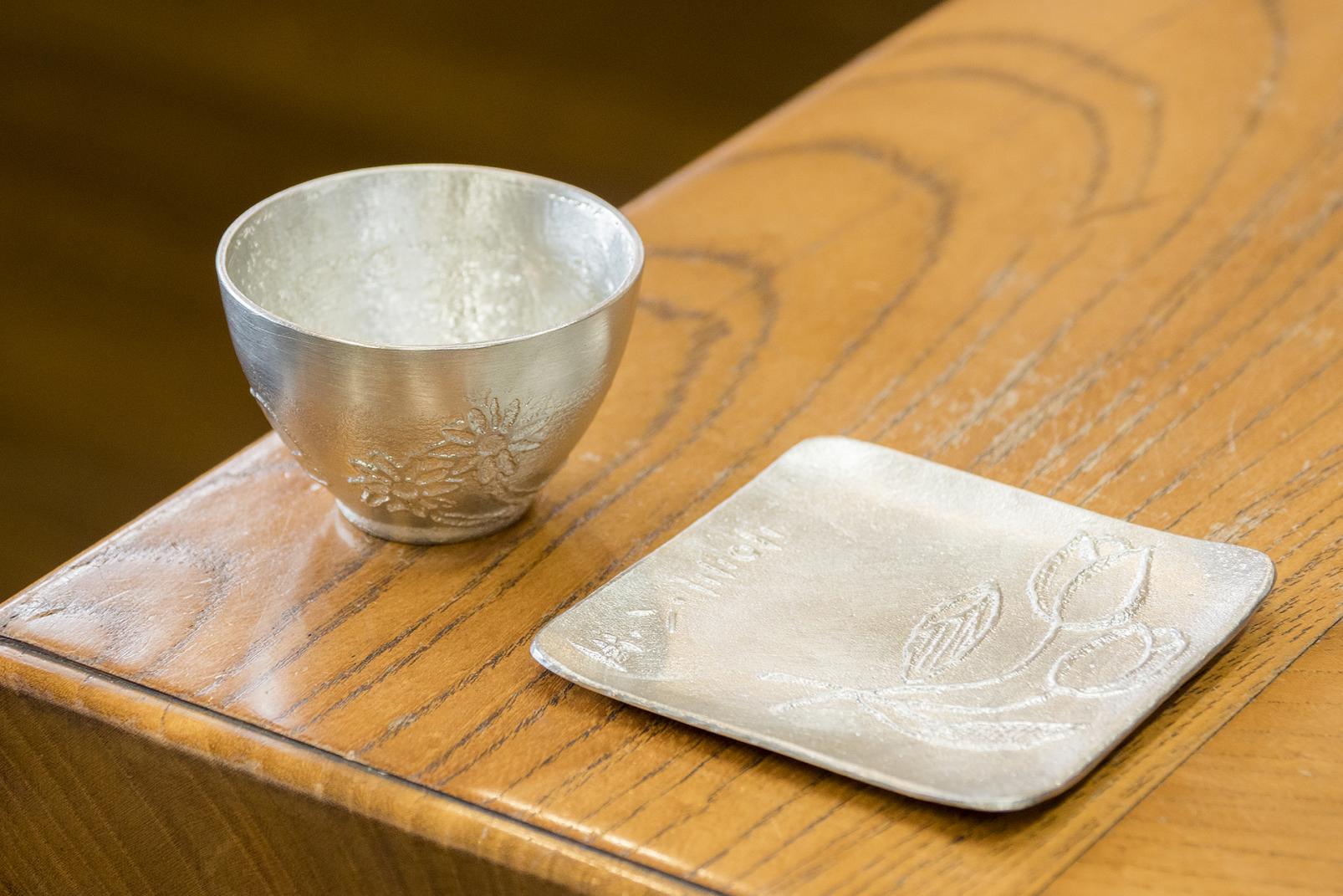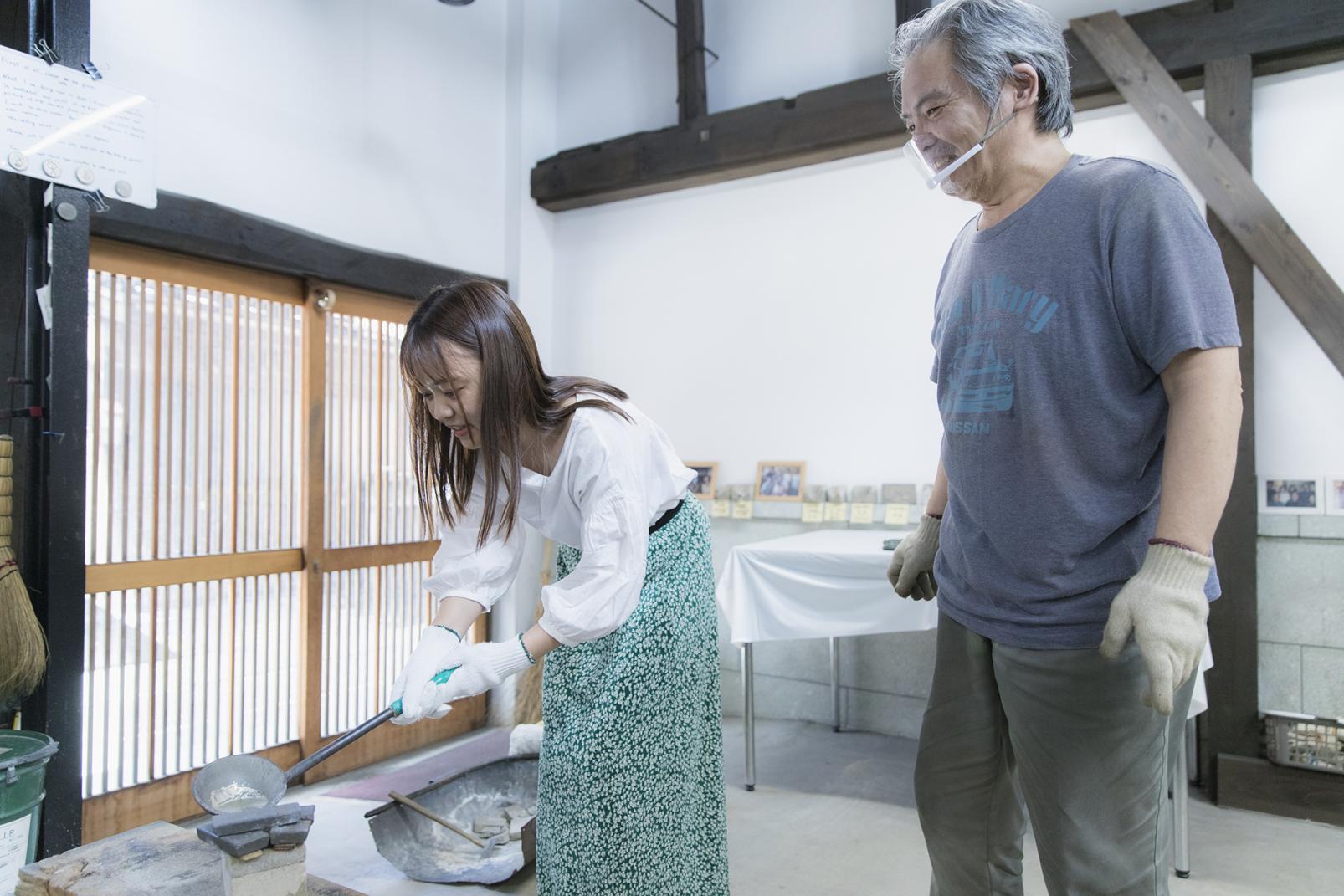「鋳物工房 利三郎」では錫の制作体験ができます。制作できるのは、ぐい呑みや小皿など。デザインを決めたら、釘のような棒で砂型を削ります。型が完成したら、店主の神初さんが目の前で錫の塊をバーナーで溶かしてくれました。錫の流し込みの作業は少し緊張しますが、そばで見ていてもらえるので安心。錫が固まったら型から外し、約1時間ほどの制作体験は終了。