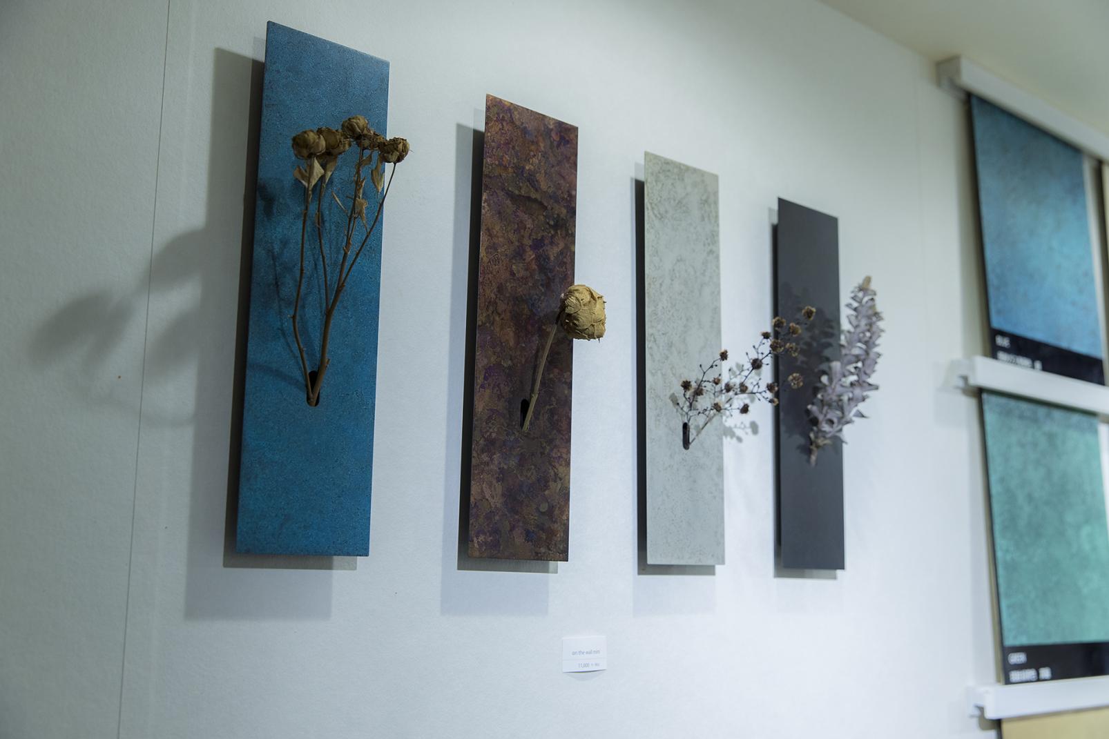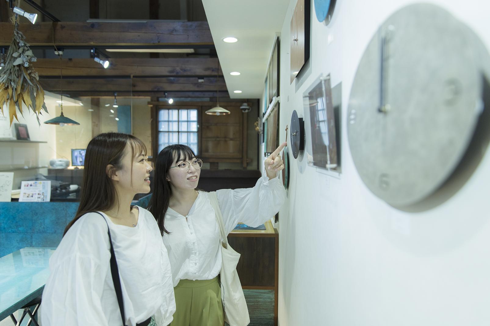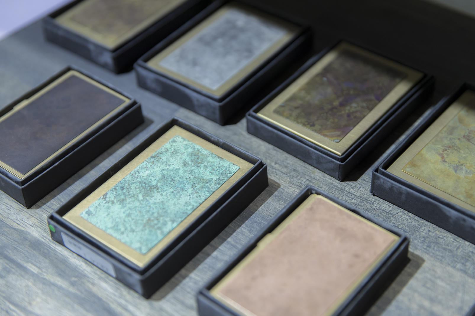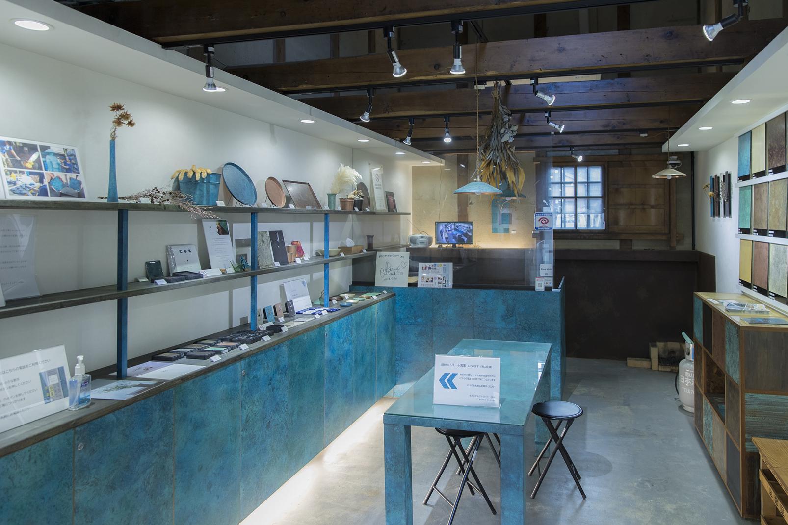 中庭に面した「Orii garally」では、時計や名刺入れ、花器など、高岡鋳物の伝統技法で着色したオリジナルの製品が見られます。